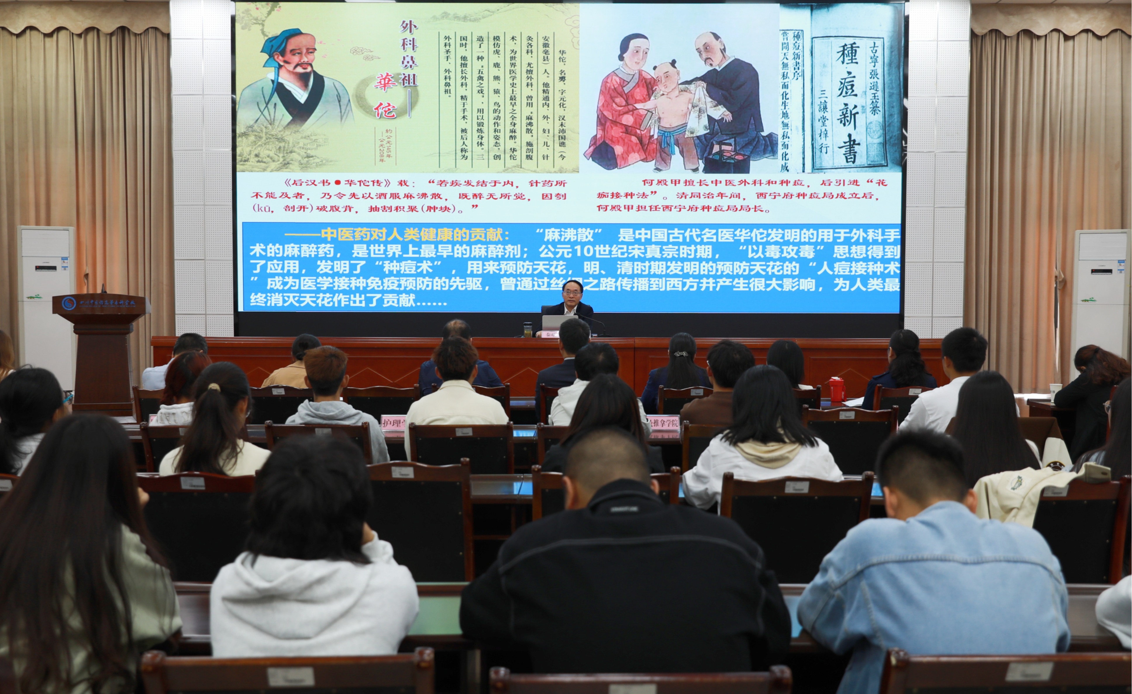 秦晓明以《在传承和弘扬优秀民族文化进程中不断书写奋斗的青春之歌》为主题,紧紧围绕“传承和弘扬优秀民族文化应保持定力学深悟透”“传承和弘扬优秀民族文化应抢抓机遇教学相长”“传承和弘扬优秀民族文化应品学兼优岗位成才”三个环节,深刻阐释了优秀民族文化的内涵、特点和价值,回顾了新中国成立以来党和国家传承、弘扬中医药文化的发展历程。他从办学模式、服务理念、发展路径、发展重点、发展保障等维度分析了学校高质量发展目前面临的政策、市场、现实等机遇,并结合我校人才培养实际和青年学生的学习成长规律,对全校同学提出了殷切期望。他指出,全校青年师生赶上了感天动地的新时代,一定要唱好唱响医专学子青春之歌——在思想认识上保持好读书、读好书、善读书的学习理念;在具体行动上践行自我教育、自我管理、自我服务、自我监督、自我提升循环往复、久久为功;在路径步骤上保持“四心”、强化“四力”、做到“四好”。全校师生要通过持续深入学习贯彻习近平新时代中国特色社会主义思想,在知信行统一和学思践悟上体现出最生动、最现实、最直接、最丰富的实践与检验,加快推进我校高质量发展。