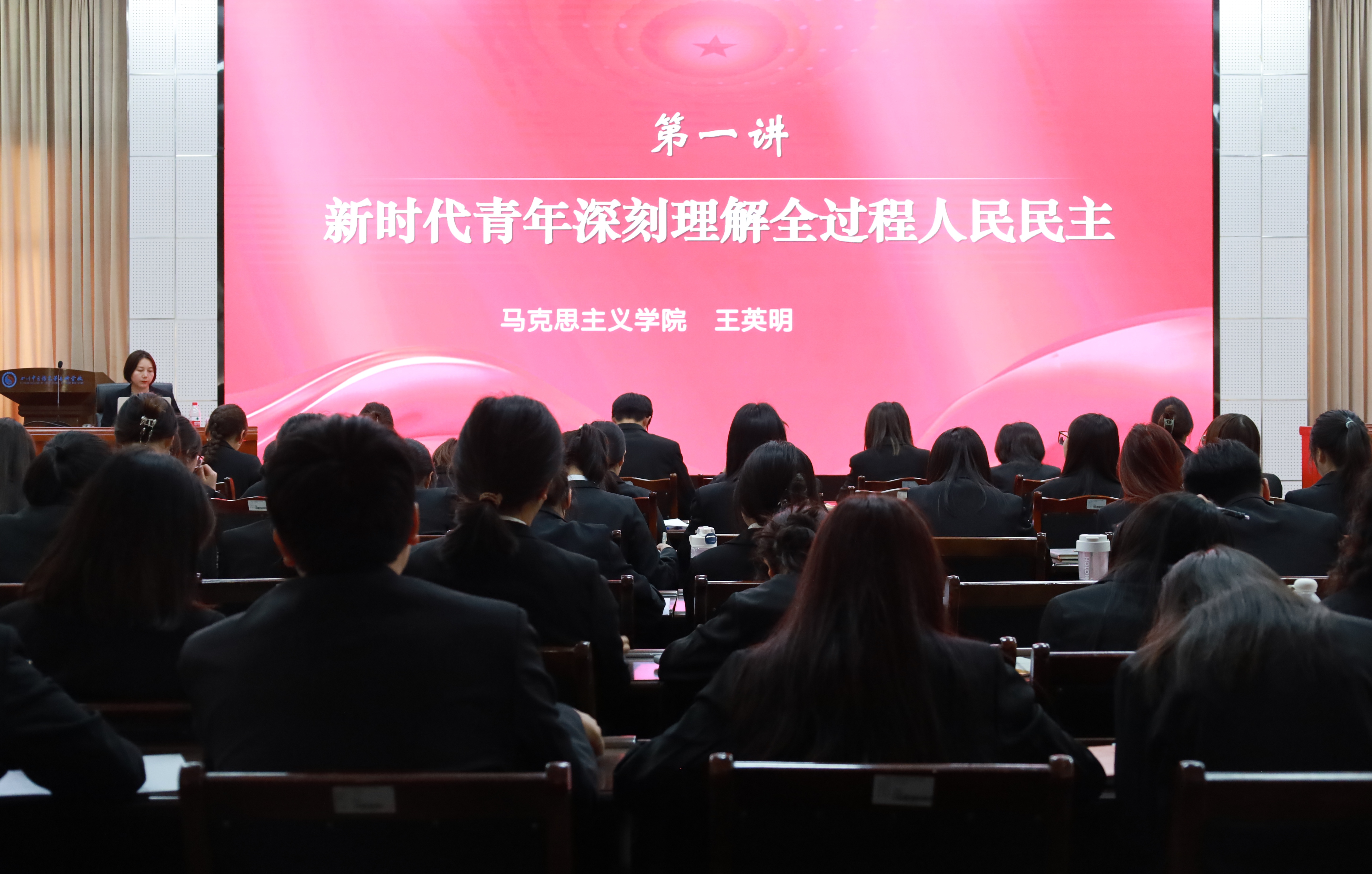 随后,马克思主义学院王英明老师作《新时代青年深刻理解全过程人民民主》专题讲座,为第五届“青马工程”培训班学员讲授了主题鲜明、内涵丰富、别开生面的开班第一课。