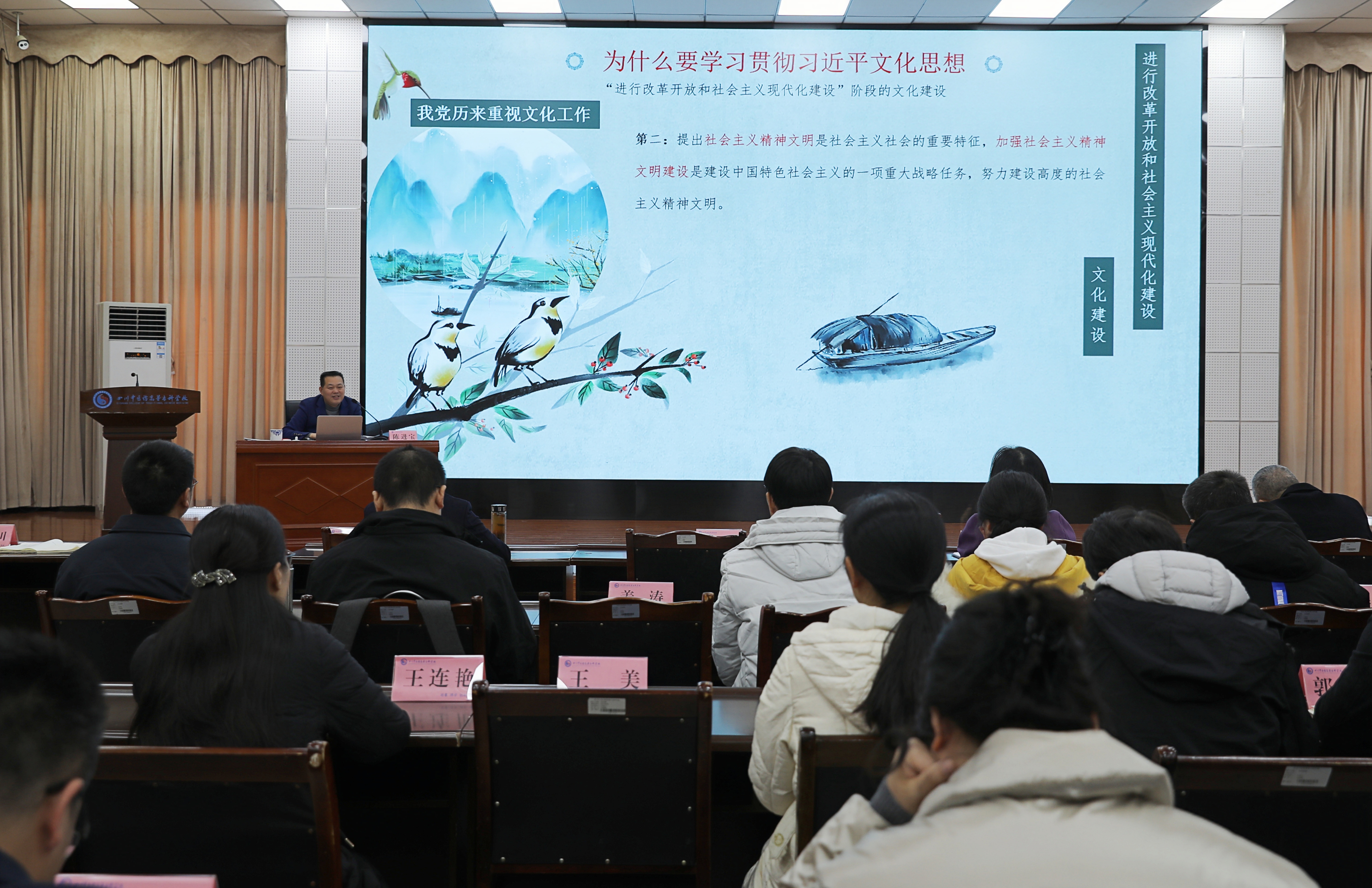 12月30日,我校召开2024年第12次党委中心组学习(扩大)会,邀请绵阳市委宣传部副部长、二级调研员陈进宝作《深入学习贯彻习近平文化思想 切实担负新时代新的文化使命》专题辅导报告。党委理论学习中心组成员以及全体管理干部参加会议。