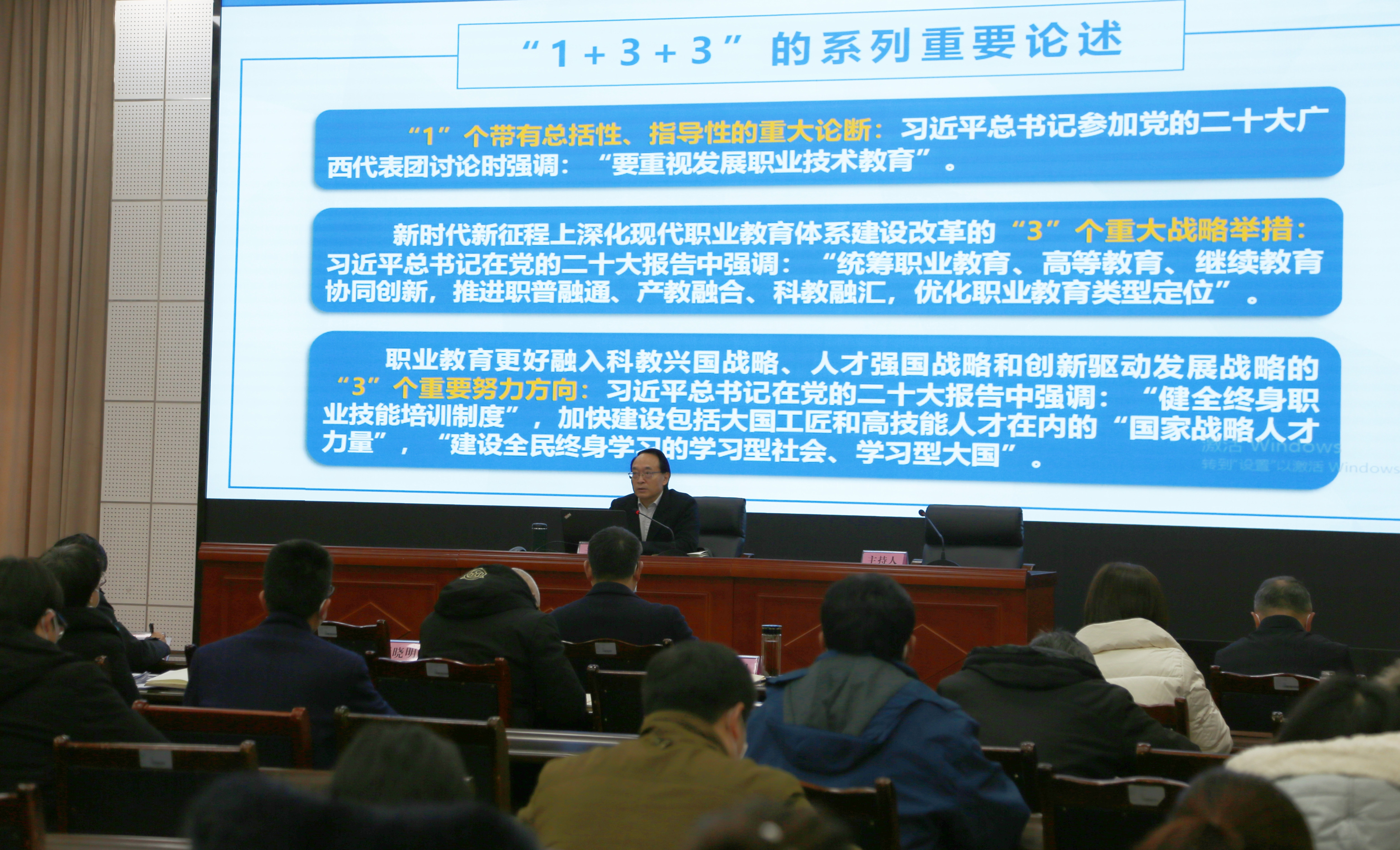 校党委书记秦晓明在会上解读了《关于深化现代职业教育体系建设改革的意见》精神,强调要立足“三服务”、统筹“三协同”、推进“三融合”,深刻把握深化现代职业教育体系建设改革的内在逻辑和实践要求,巩固拓展以教促产、以产助教、产教融合、产学合作四位一体,推动形成与市场需求相适应,与产业结构相匹配的现代职业教育结构区域布局;要结合我校自身特点与优势,形成完善政府、行业、企业、学校协同合作发展机制,加快办学格局的转变,在现代职业教育体系建设改革上先行先试、率先突破、示范引领。