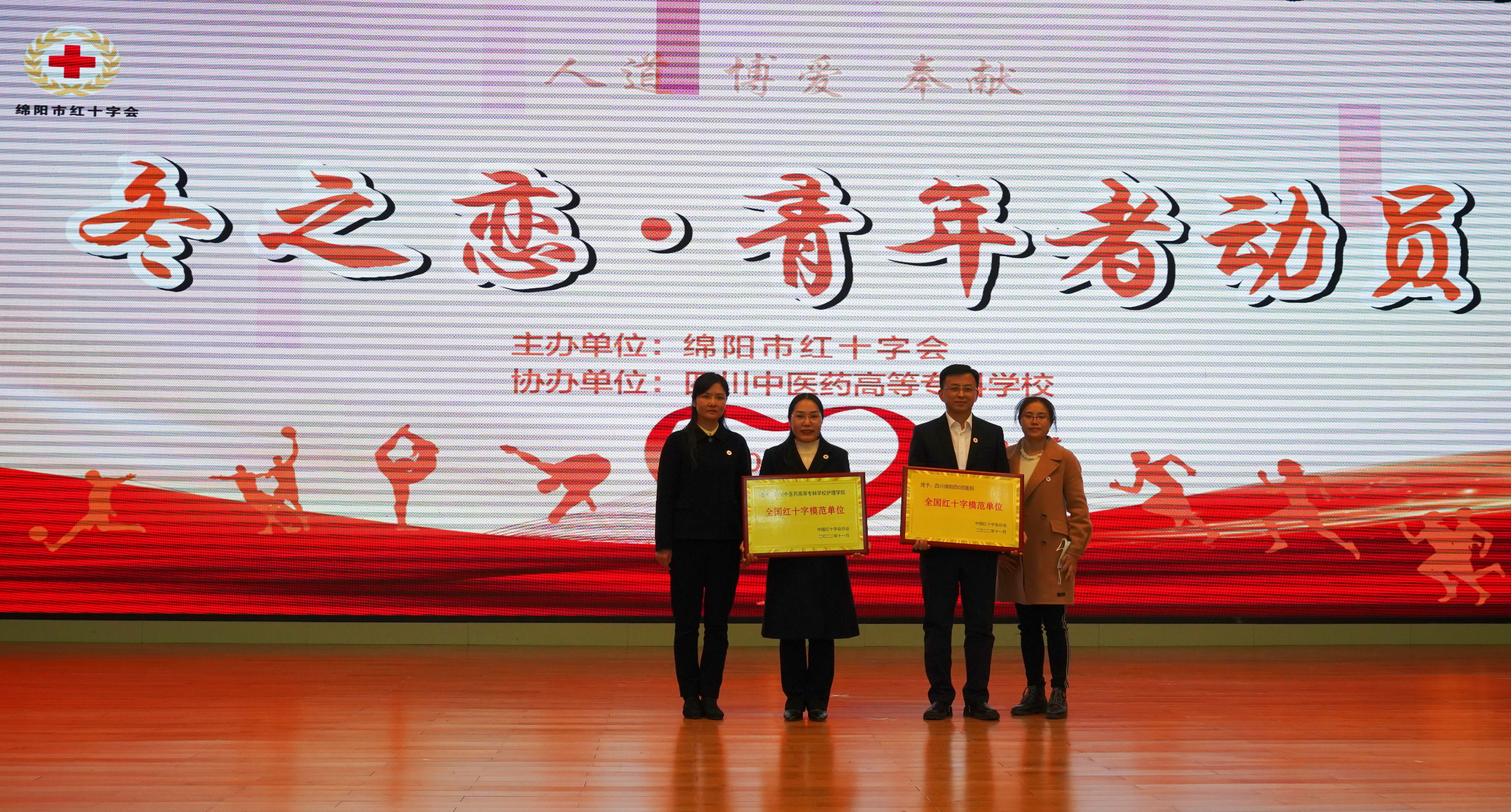 12月8日,我校与绵阳市红十字会联合举办了2022年冬之恋——青年者动员暨造血干细胞捐献活动,活动中305名学生参与了造血干细胞捐献;绵阳市红十字会常务副会长易志红、副会长张周蓉分别为我校护理学院和四川绵阳四0四医院颁发了“全国红十字模范单位”奖牌。校党委副书记汪涌泉出席本次活动。