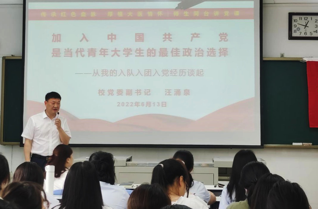 6月13日,护理学院党总支开展“坚守初心育人才,一心向党担大任”主题党日活动,该学院全体党员教师、入党积极分子代表、团学干部等50余人参加党课学习;校党委副书记汪涌泉与师生同台讲党课。