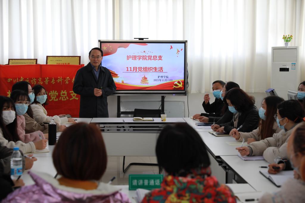 2021年11月11日,护理学院党总支开展了“学习贯彻绵阳市第八次党代会精神宣讲报告”的主题党日活动,校党委书记秦晓明、护理学院党总支党员和入党积极分子参加。