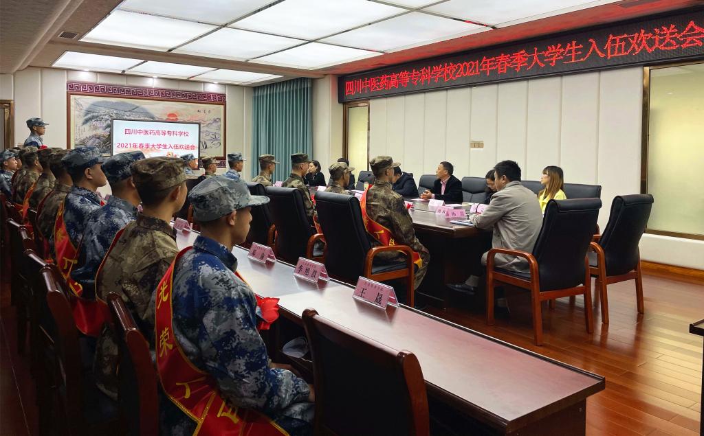 欢送会上,入伍大学生们逐一介绍了自己的基本情况和理想,副校长席斌和武装部、各学院的负责人为入伍大学生们送上了学校专门定制的入伍纪念章和学习笔记本。席斌从我国国防和军队建设“十四五”规划对全面推进国防和军队现代化建设要求入手,为入伍大学生们上了一堂简短而精彩的国防教育课,希望同学们以止戈为武、建设国防为目标,在部队这个大舞台上展示自己、成就自己;到部队后除了要练好军事本领外也不要荒芜了专业知识,发挥好医学方面的特长,展现当代青年的特色,展示医专学子的能力和水平,勇立新功,学校期待听到大家传来的捷报。