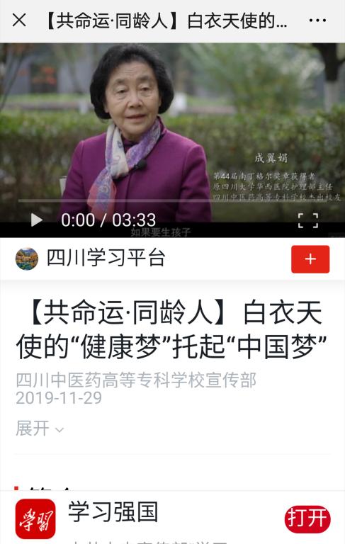 11月29日,在中国梦提出七周年之际,我校制作的微视频《白衣天使的“健康梦”托起“中国梦”》在《学习强国》平台播出,通过讲述我校杰出校友、南丁格尔奖章获得者成翼娟教授致力于护理事业的发展,在母校建立了西南地区首个医学专科学校南丁格尔志愿护理服务分队;指导母校申报成为全国首批护理专业现代学徒制试点单位等事迹,展现了我校师生老、中、青三代人不忘初心、牢记使命,在各自岗位上奋发有为、默默奉献,将人道、博爱、奉献的南丁格尔精神薪火相传,更让这种精神在服务健康中国战略中熠熠生辉。