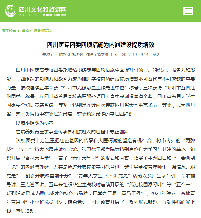 四川文化和旅游网:四川医专团委四项措施为内涵建设提质增效