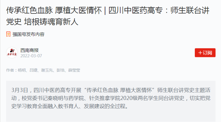 学习强国:传承红色血脉 厚植大医情怀 | 四川中医药高专:师生联台讲党史 培根铸魂育新人
