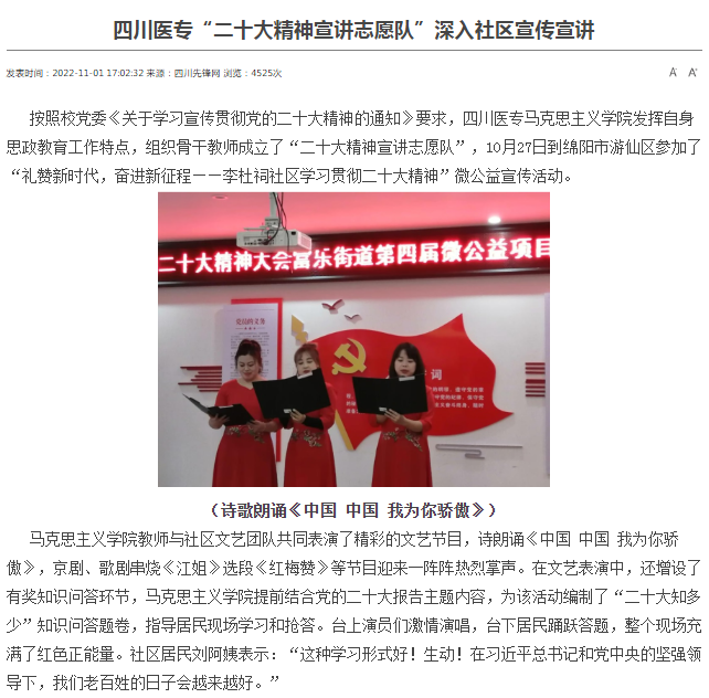 四川先锋网:四川医专“二十大精神宣讲志愿队”深入社区宣传宣讲
