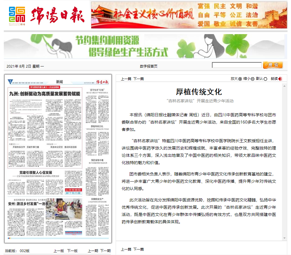 本报讯(绵阳日报社融媒体记者 周钰)近日,由四川中医药高等专科学校与团市委联合举办的“杏林名家讲坛”开展走近青少年活动,来自全国的160多名大学生志愿者参加。