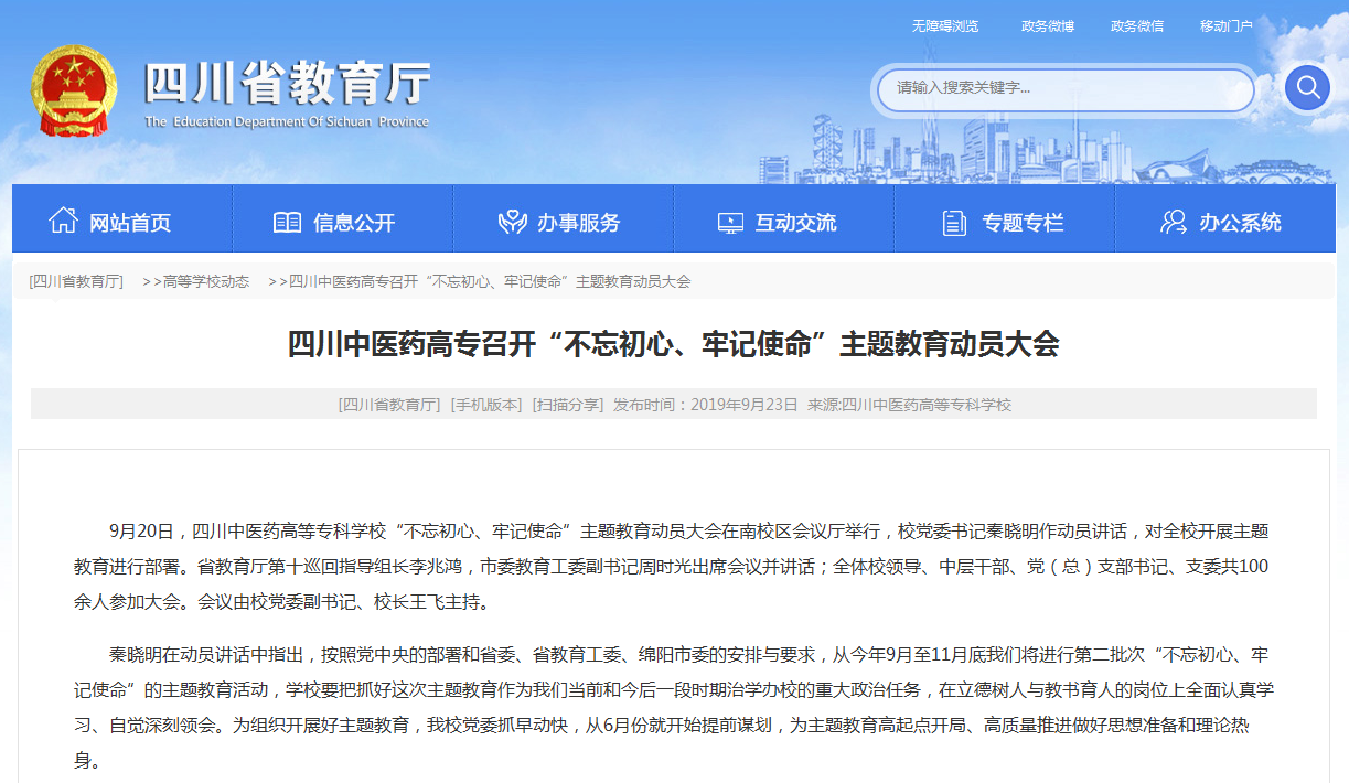 四川党建之声:四川中医药高专召开“不忘初心、牢记使命”主题教育动员大会