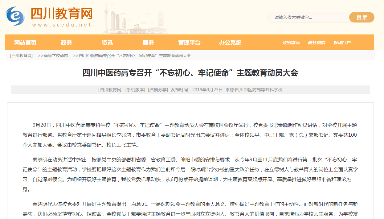 四川教育网:四川中医药高专召开“不忘初心、牢记使命”主题教育动员大会