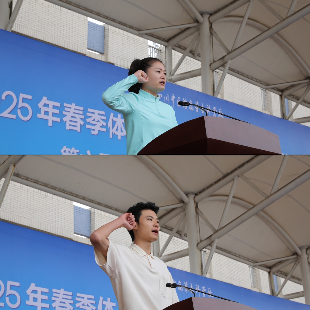运动会开幕式由校体育运动委员会主任、副校长梁晓峰主持;体育教师杜阳、学生代表何坤隆分别代表裁判员、运动员进行宣誓。