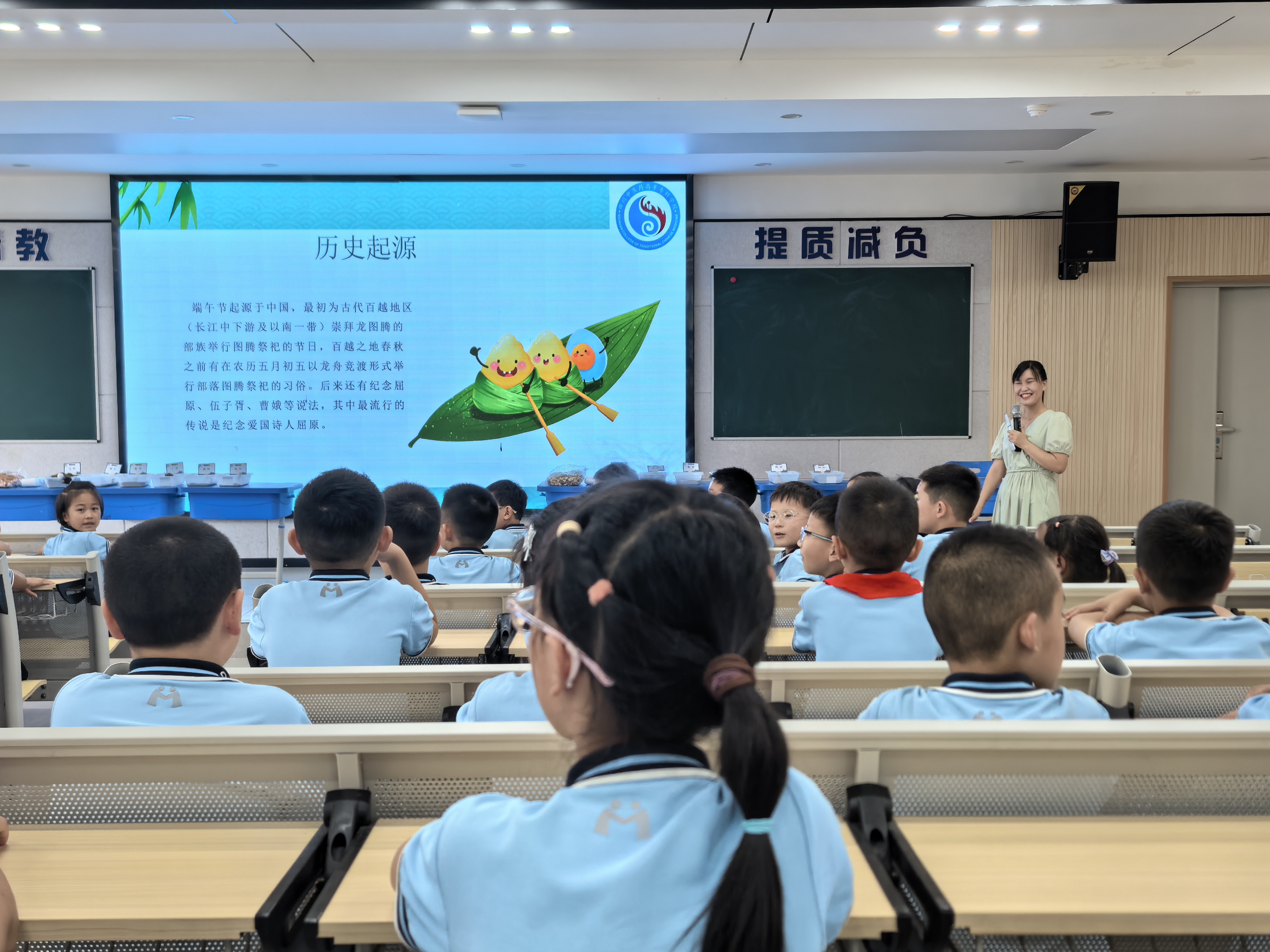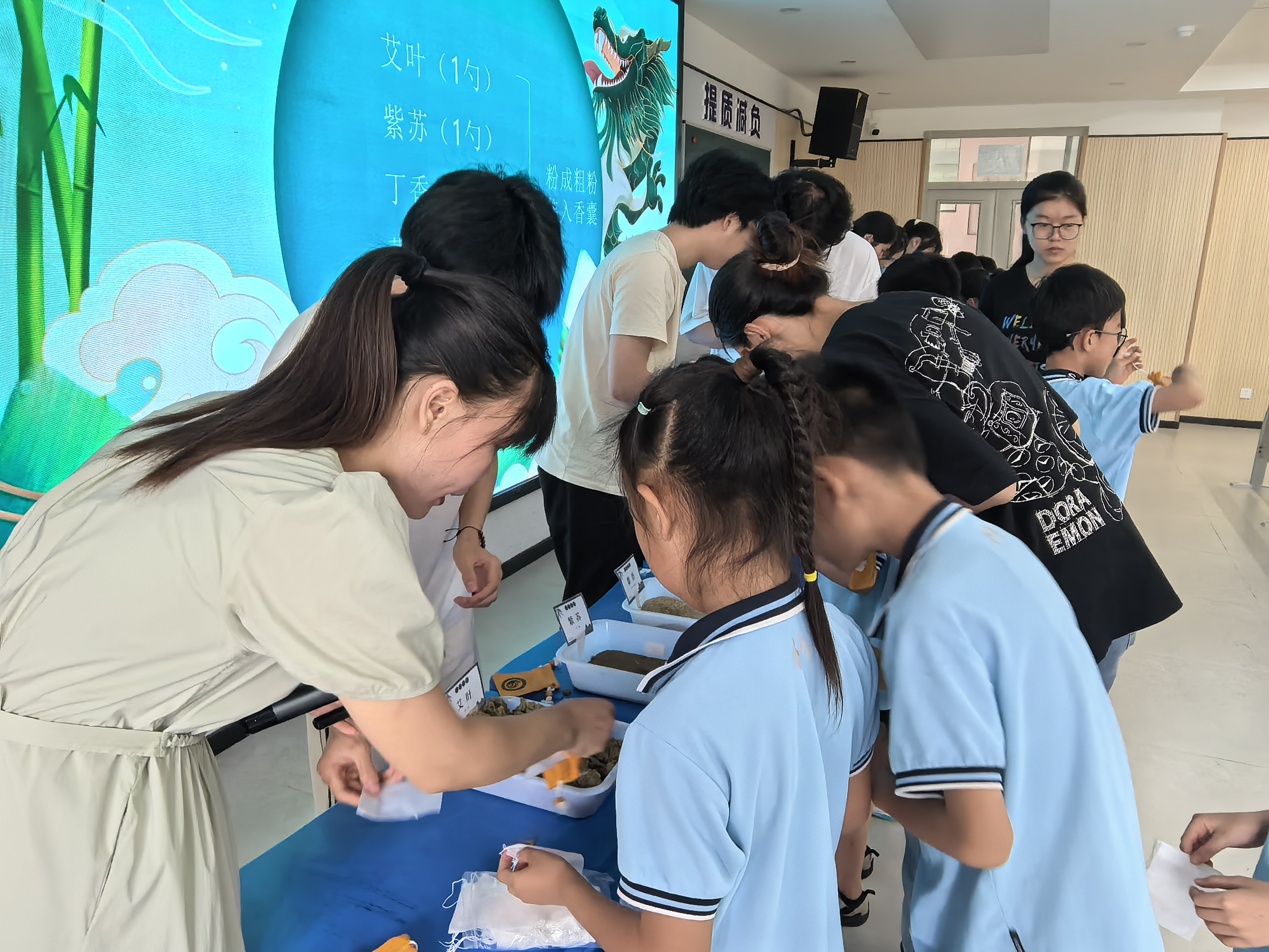 韩瑞伟教授通过PPT生动展示“端午文化科普+中药香囊制作”,融合“屈原故事+爱国精神”与“端午习俗+健康理念”的趣味讲解,辅以艾草、菖蒲等中药材实物,引导学生感悟传统节日中的家国情怀与中医药智慧。韩教授以“小小植物家”互动问答的形式,用诸如“艾叶像绿色小卫士驱赶蚊虫”“藿香是天然空调带来清凉”等生动的比喻进行药材科普,并为答对者送上定制版“中药小书签”,引得同学们阵阵欢笑。