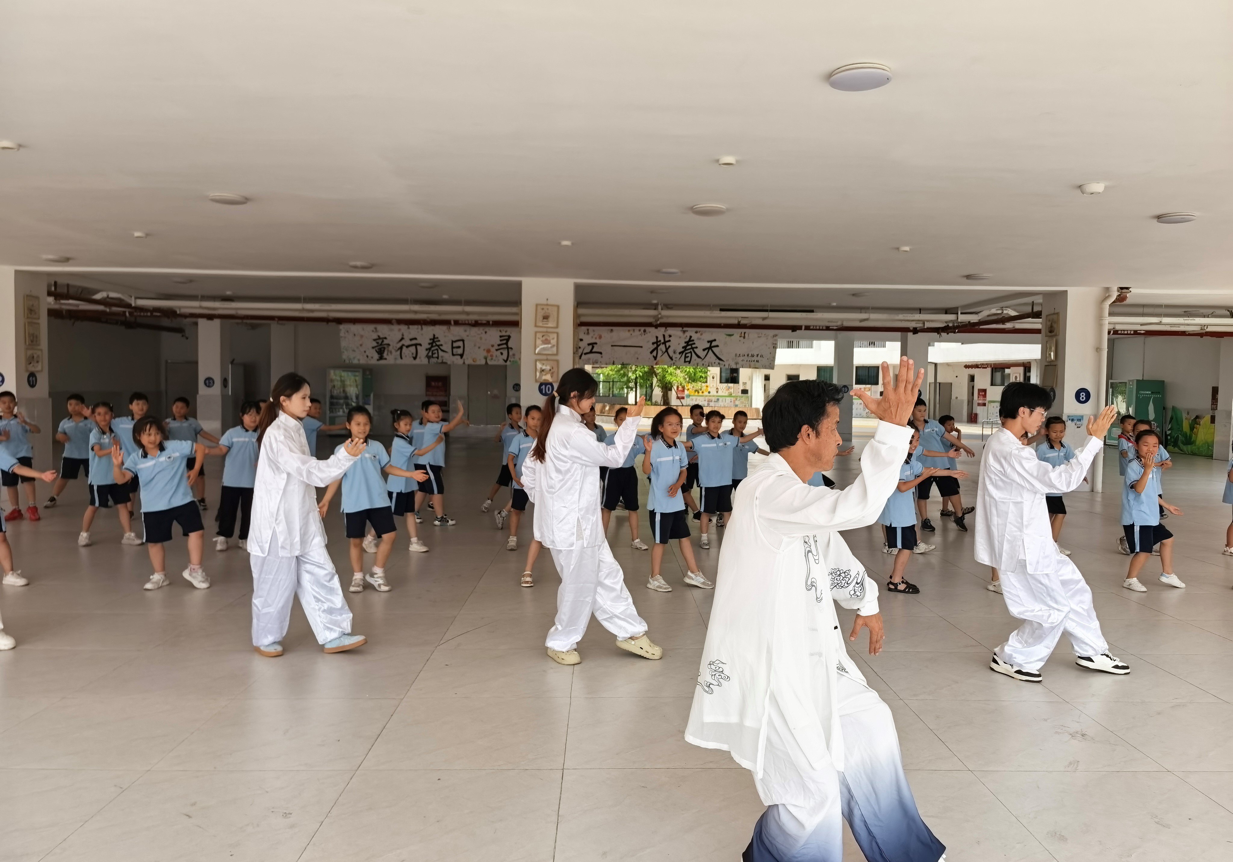 活动现场,罗庆辉老师携8名学生,带领50名二年级的同学们共演太极拳24式,以刚柔并济的动作尽显中医“动静结合”的文化魅力和养生智慧,瞬间点燃现场氛围。