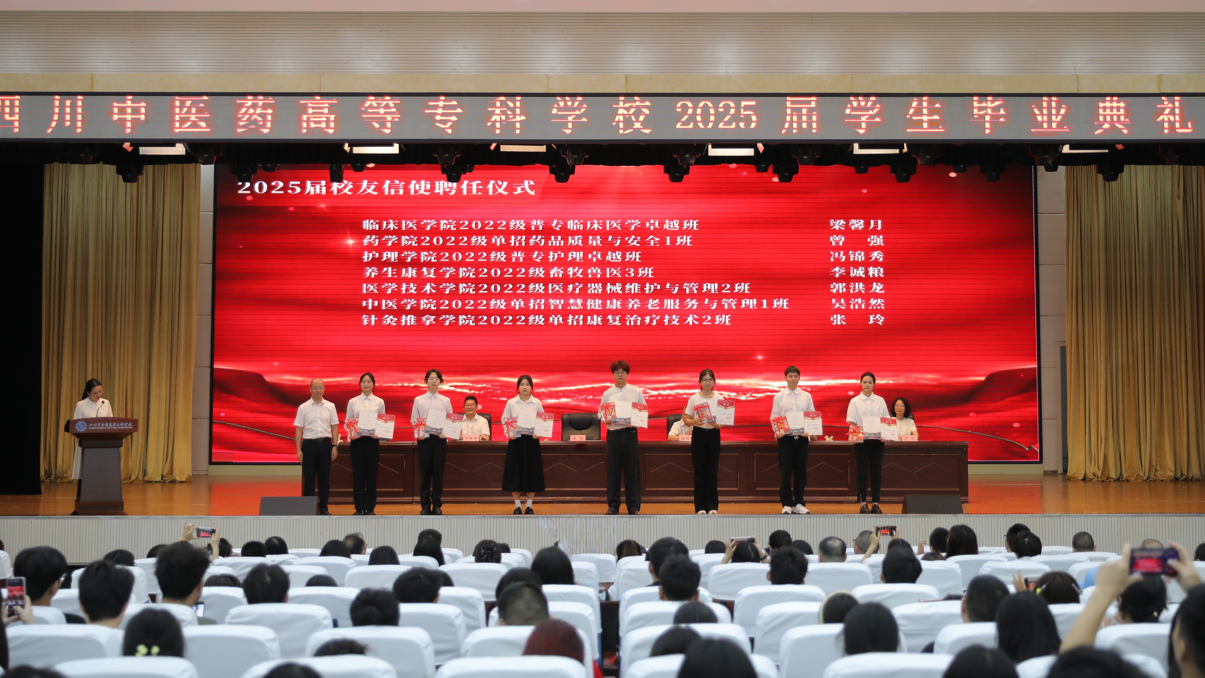 毕业典礼表彰了2025届校级优秀毕业生、省级优秀毕业生以及学校第五届“涪翁传人”求学标兵等先进个人。药学院2022级单招药学2班王思媛作为毕业生代表发言,她回顾了医专三年求学经历,表达了对学校、老师和同学们的感激之情,并号召毕业生们牢记使命担当,为祖国的医药卫生事业贡献青春力量。