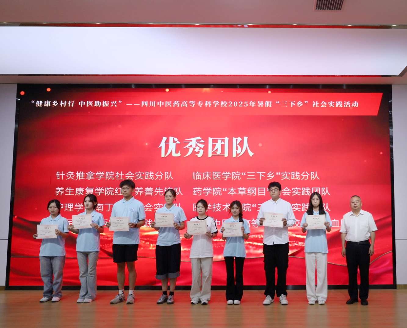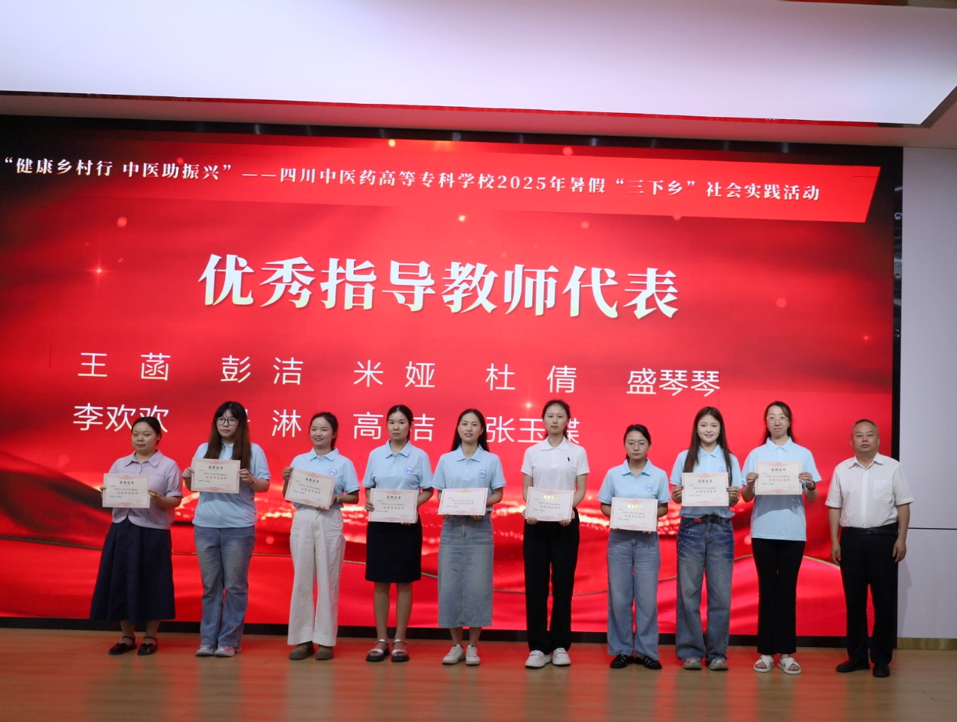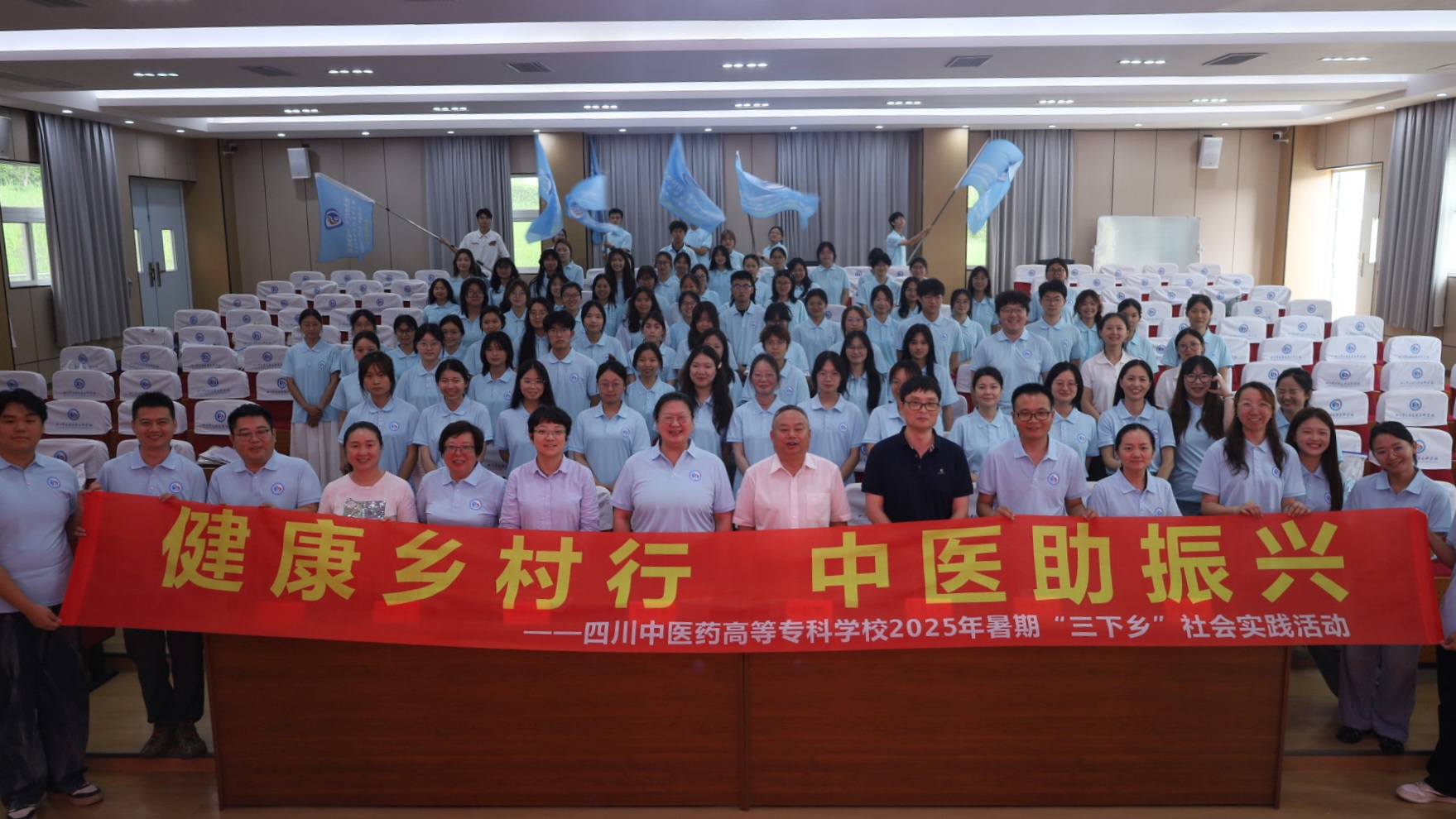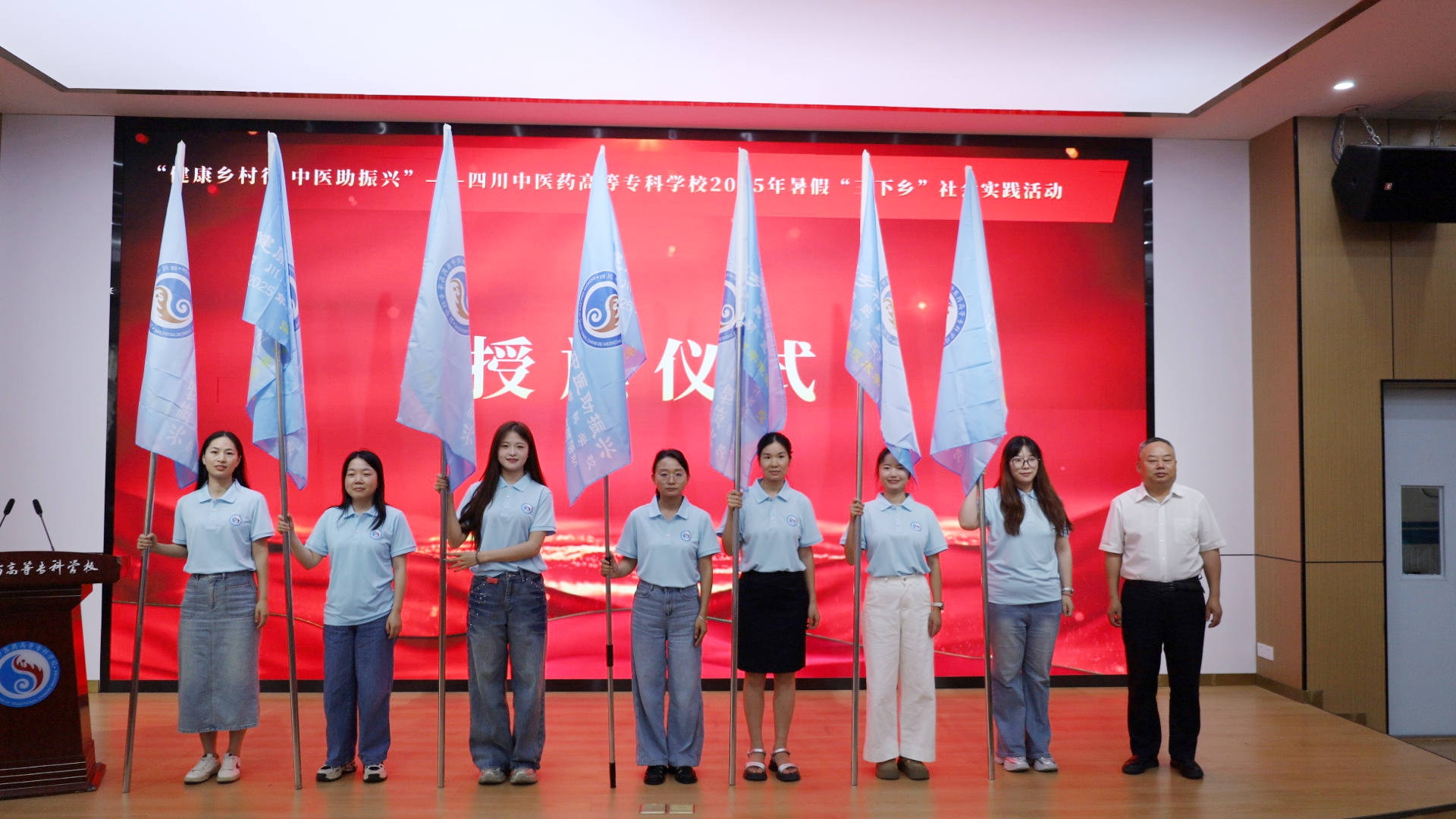 出征仪式上,相关负责人宣读了《关于表扬2024-2025学年社会实践活动先进集体和个人的通知》,对优秀团队、优秀指导教师和先进个人进行颁奖。随后,商碧辉为各实践分队代表授旗,标志着团队成员们正式踏上服务基层、服务乡村的新征程。在庄重的宣誓仪式上,志愿者们表示将牢记“德馨 博学 创新 奉献”的校训,竭尽全力、不负重托,以实际行动发扬“奉献、友爱、互助、进步”的志愿者精神和“团结奋斗,追求卓越”的四川中医高专精神,为助力乡村振兴、推进“健康四川”建设贡献力量!