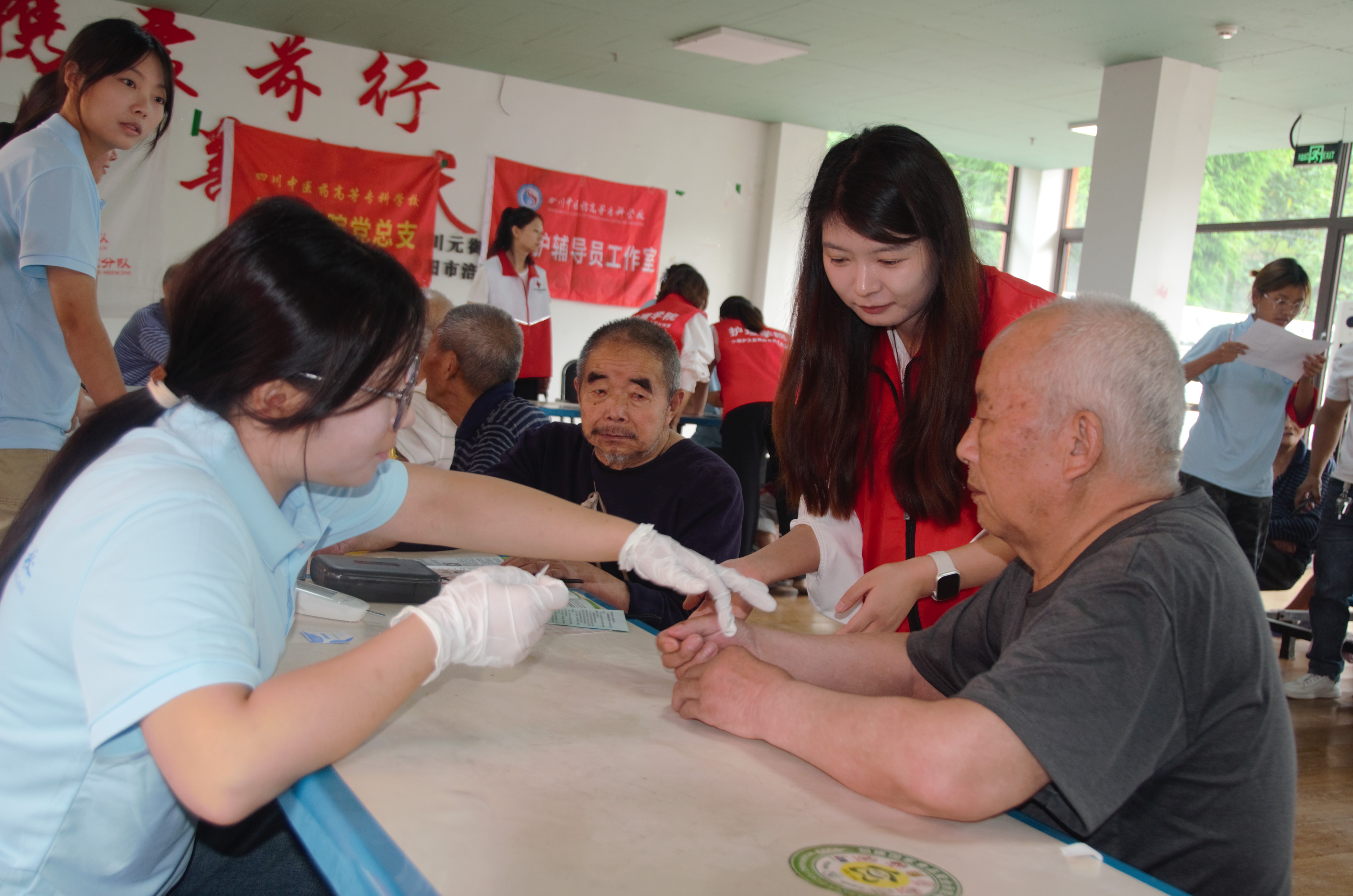 7月3日,在绵阳市丰谷镇敬老院里,一群身着印有“四川中医药高等专科学校”浅蓝色T恤的志愿者们,为老人测量血糖、推拿按摩、组织艾灸、演示中医养生操和宣讲日常保健知识等。敬老院里不仅格外的热闹,而且处处还充满着温暖和关爱。