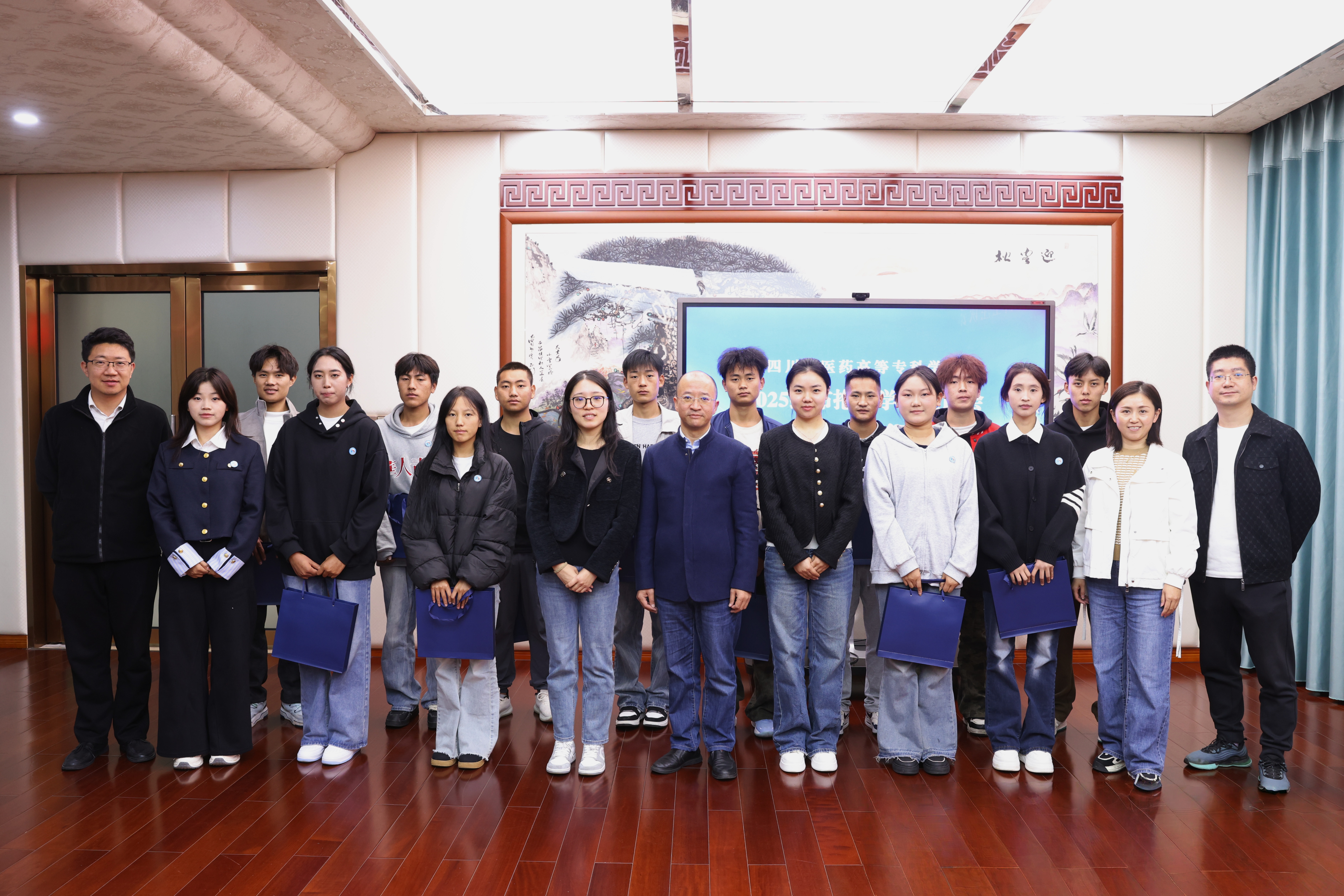 会议最后,李祥等为布拖籍新生佩戴校徽、赠送纪念品,并合影留念。