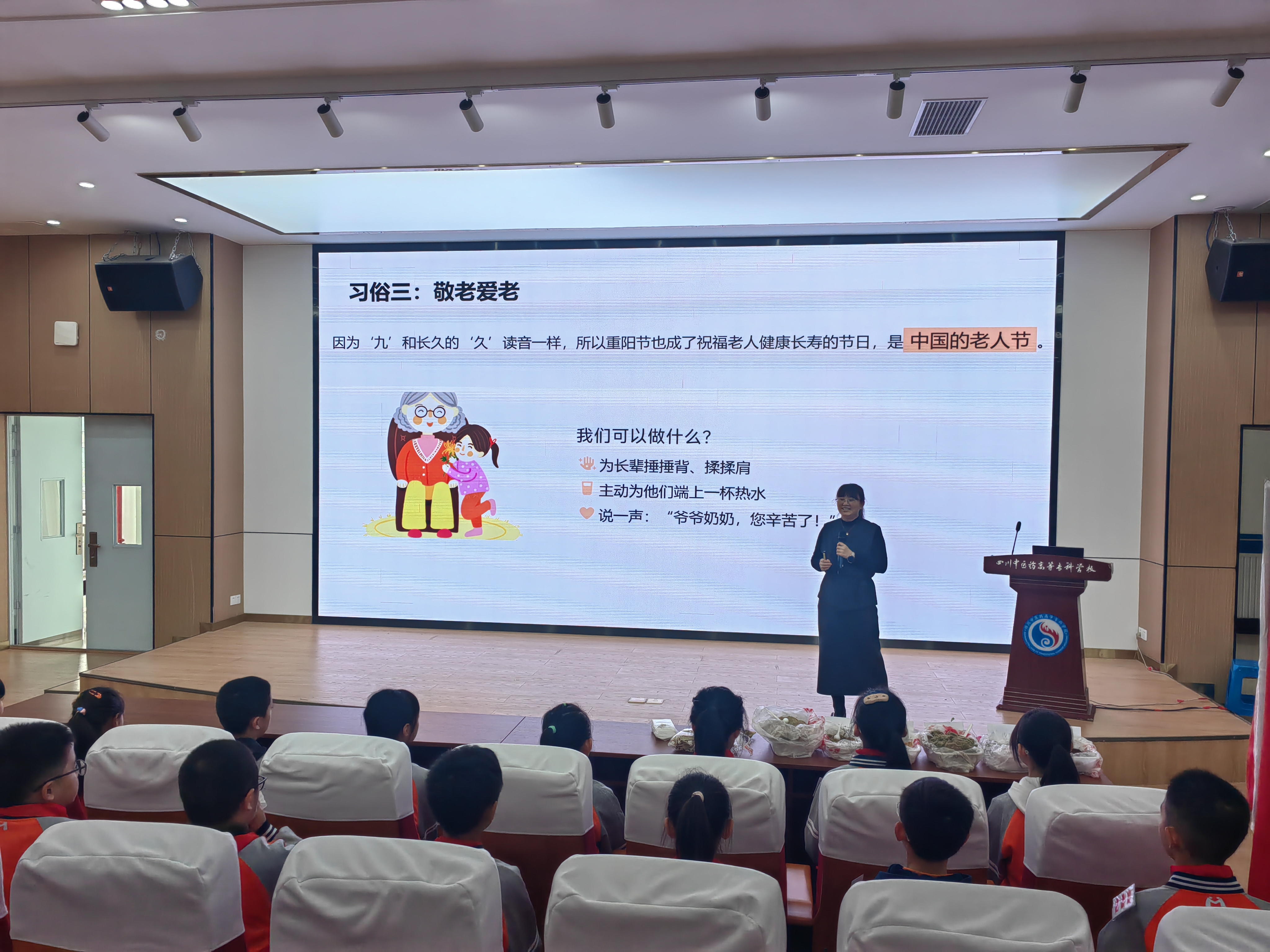 药学院负责人介绍了学校的整体情况并带领玉小的师生们依次参观了学校中医药文化馆与中药标本馆。教师林秋霞以“重阳节—登高敬老与神奇香囊”为主题,将中医药知识与孝亲敬老的中华美德巧妙融合,向小学生们讲解了重阳节佩戴香囊的习俗与中医药防病保健的原理,展示了香囊的整个制作流程,还亲自指导孩子们亲手完成香囊的制作。