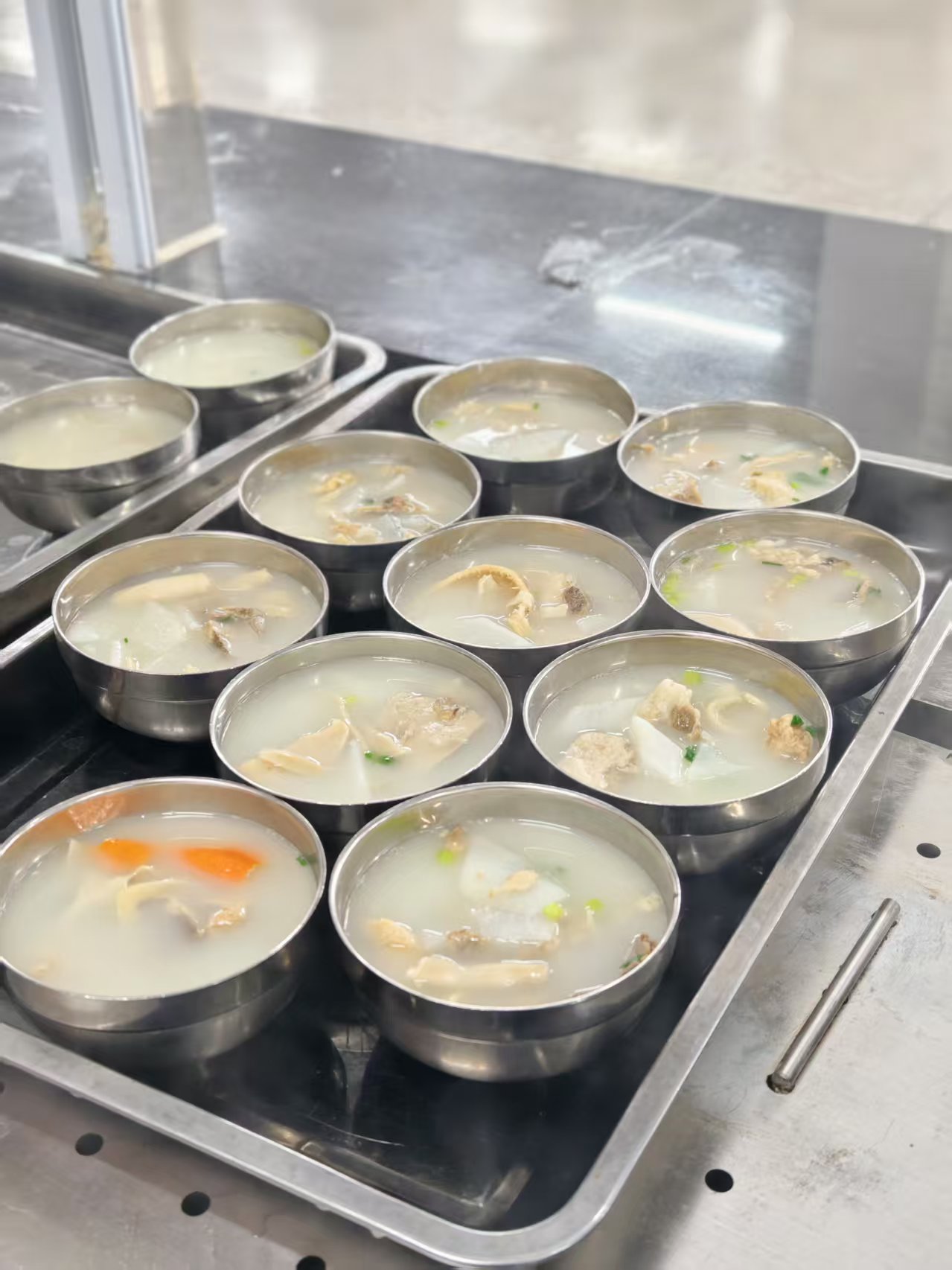 窗口前,十多个小碗整齐列阵,盛满了奶白滚烫的羊肉汤,肉块、萝卜、葱花在碗里“开大会”,还混进几片“显眼包”胡萝卜。穿米白羽绒服的女生、戴眼镜围毛领的姑娘,都停下了匆忙的脚步,接过这碗突如其来的温暖。