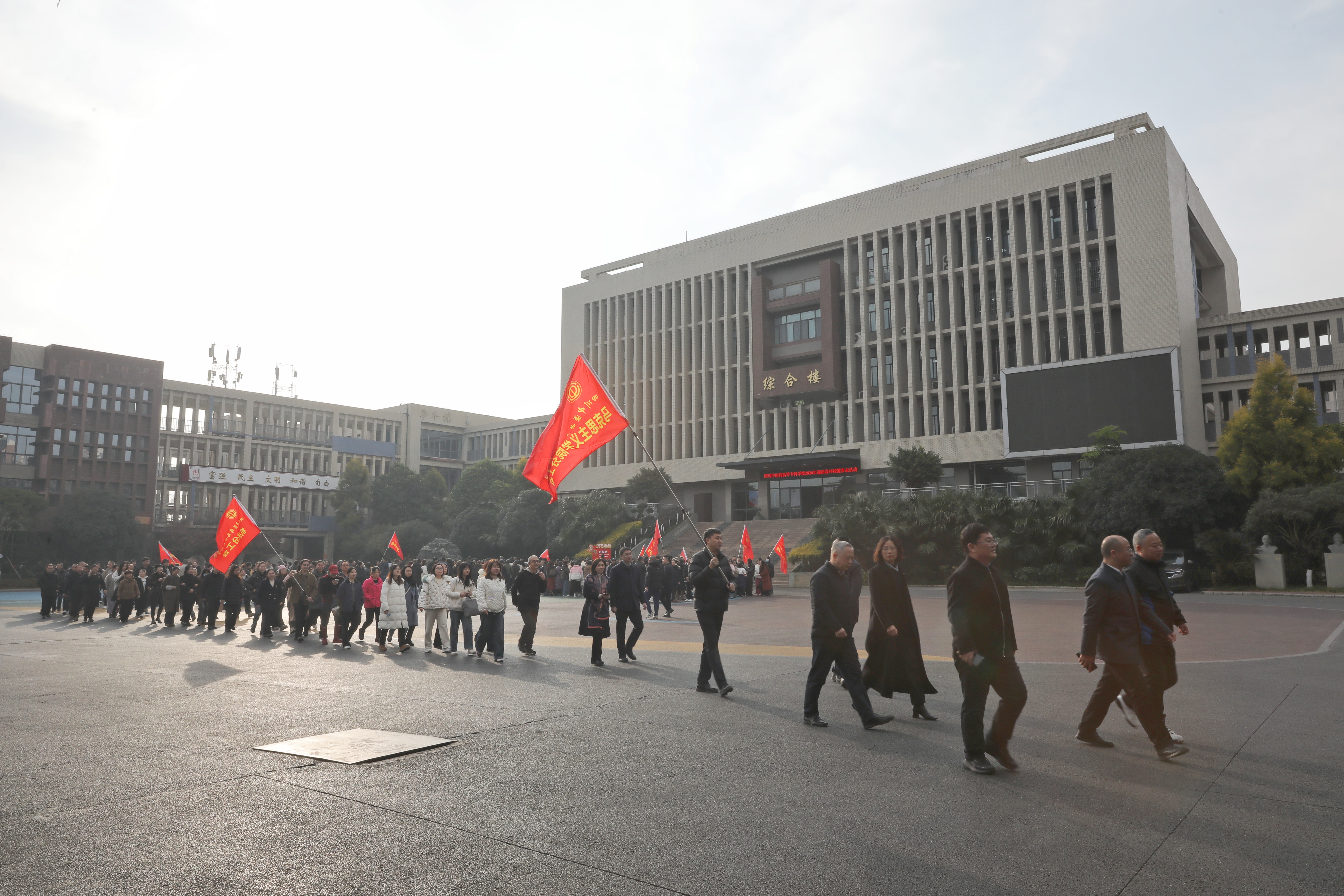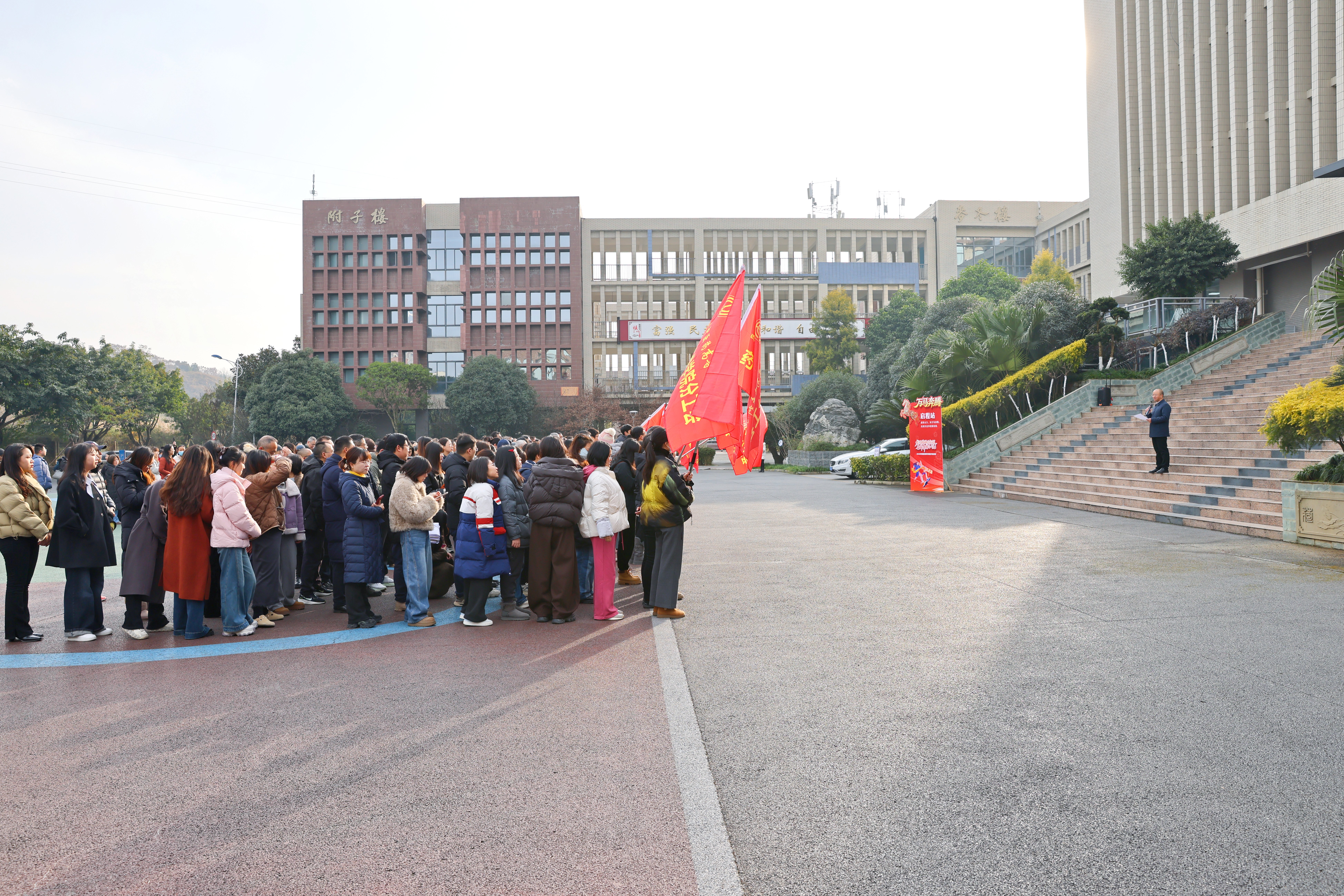 上午9时45分,各分工会在南园综合楼前准时集合,队伍整齐排列,旗帜飘扬。10时整,校领导作动员致辞,勉励全体教职工以“龙马精神”投身学校发展,并宣布健步走活动正式开始。