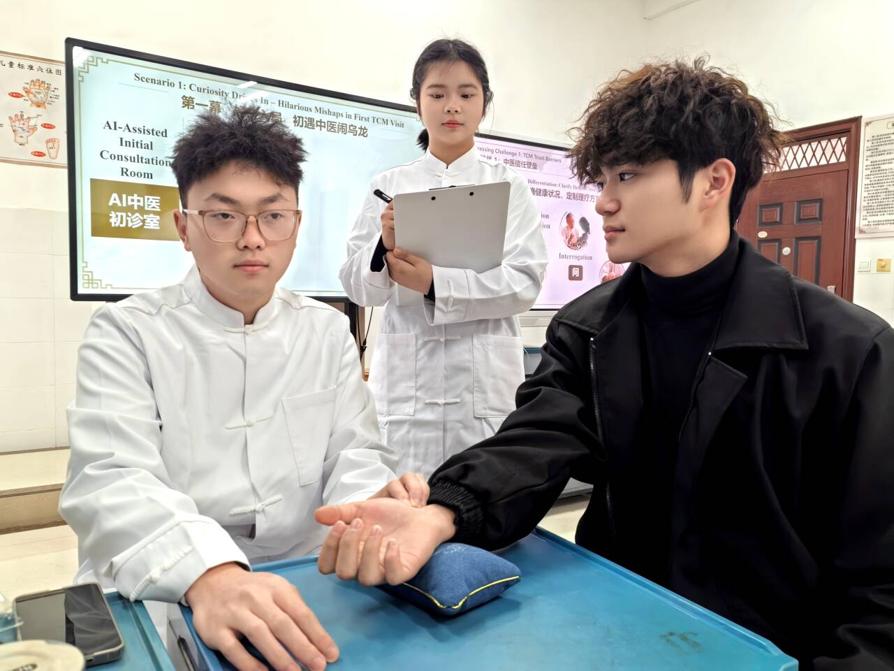 项目立足国家“中医药走出去”战略,聚焦新加坡职场亚健康调理的真实需求,将中医药适宜技术与海外服务场景深度融合,打造可复制的中医药海外标准化服务模式。备赛期间,团队一方面反复打磨推拿、拔罐等专业技能,精准把控切脉、触诊、闪罐、留罐等操作细节;另一方面深耕全英文专项训练,针对剧本对话、项目讲解、海外健康问询等内容反复模拟演练,全力攻克备赛难点。比赛现场,团队以全英文情景表演形式,生动演绎了为新加坡职场人群提供肩颈亚健康调理的全流程,从AI智慧诊疗、中医辨证诊断,到标准化推拿、拔罐操作,再到跨文化健康指导与康养科普,学子们各司其职、配合默契,将中医药专业技能与全英文跨文化沟通能力完美融合,赢得评委高度认可。