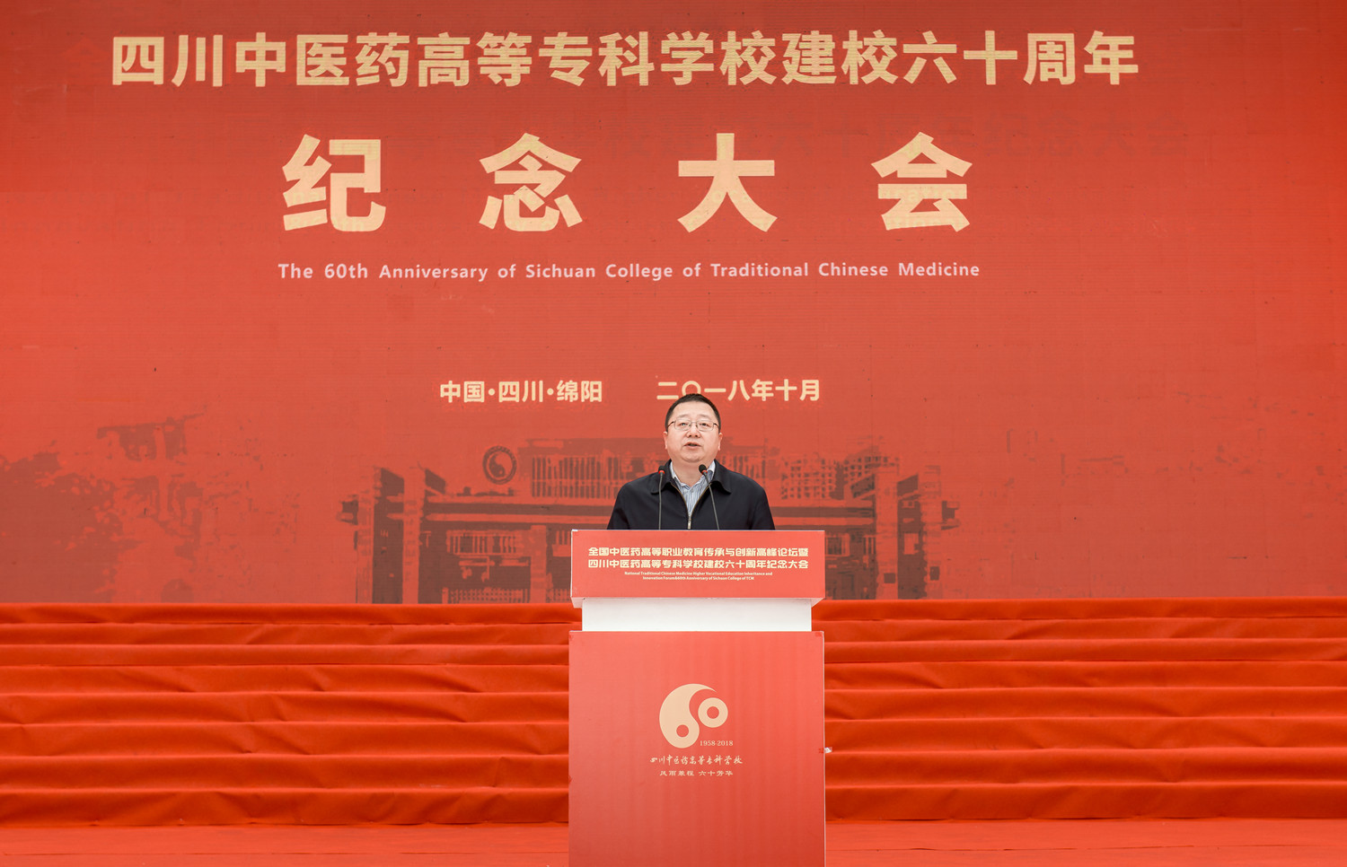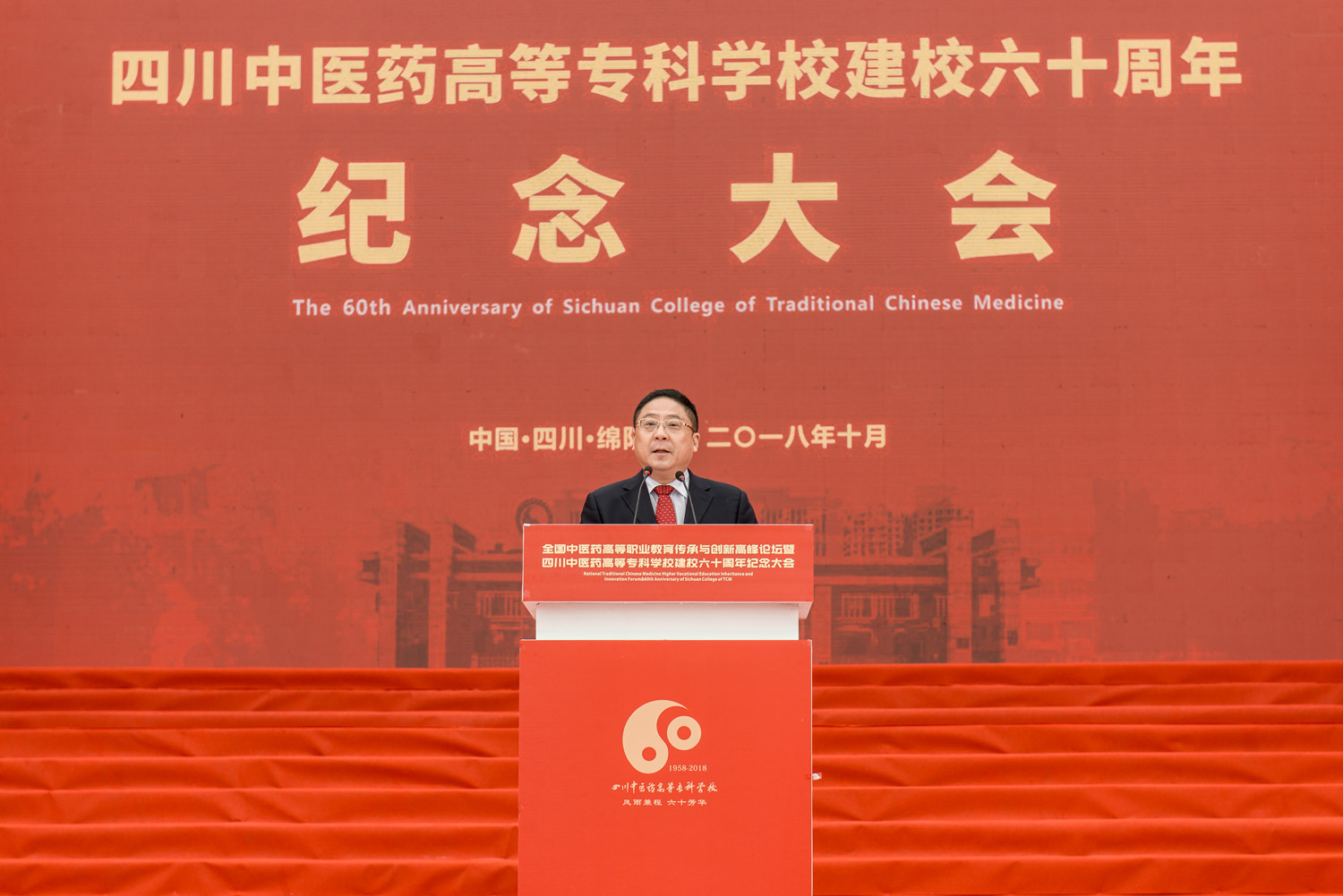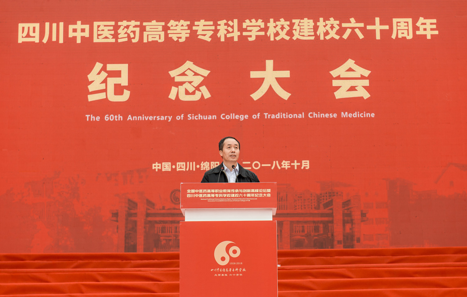 10月20日,我校在南校区举行建校60周年纪念大会,原卫生部副部长、国家健康教育首席专家、中国医师协会终身名誉会长殷大奎,国家中医药管理局人事教育司副司长张欣霞,绵阳市委副书记、市人民政府代市长元方,四川省教育厅巡视员胡卫锋,四川省卫计委副巡视员陈运,四川省民政厅老龄委主任赵汝鹏,四川省中医药管理局副局长米银军,绵阳市委常委宣传部长张学民;四川大学华西医学院、广州中医药大学、南京中医药大学、上海中医药大学、成都中医药大学等23所高校,绵阳市级相关部门、兄弟院校、友好单位的领导、专家和嘉宾出席大会。校领导班子全体成员,学校部分离退休老领导、校友、全体师生共1万余人参加大会;大会由校长王飞主持。