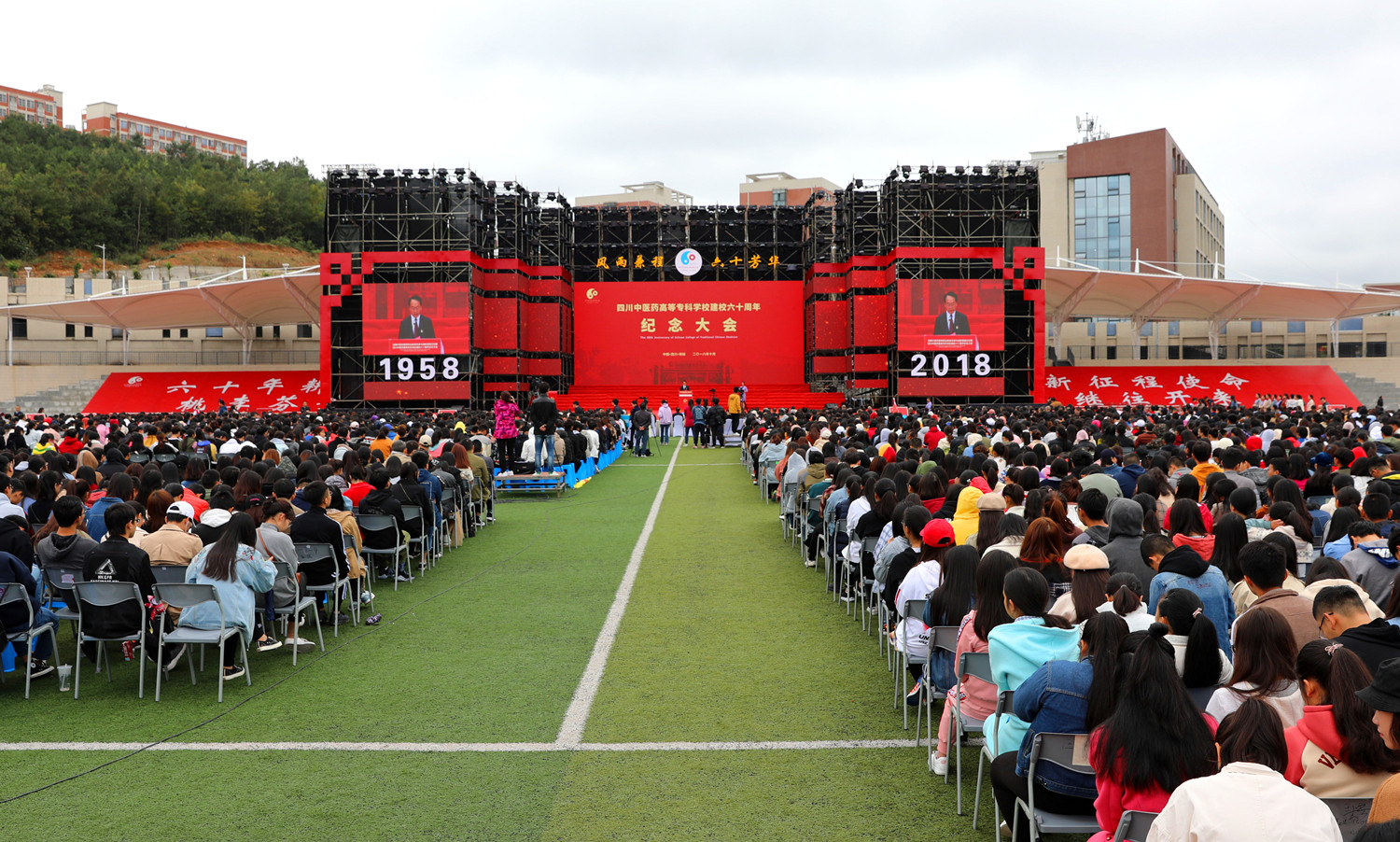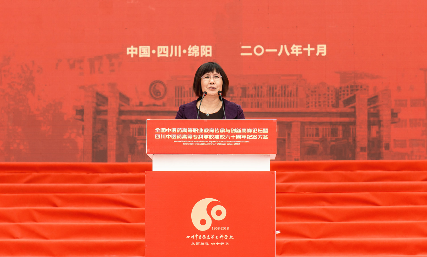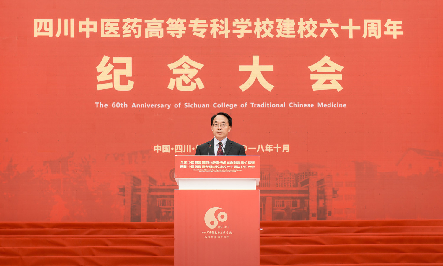 10月20日,我校在南校区举行建校60周年纪念大会,原卫生部副部长、国家健康教育首席专家、中国医师协会终身名誉会长殷大奎,国家中医药管理局人事教育司副司长张欣霞,绵阳市委副书记、市人民政府代市长元方,四川省教育厅巡视员胡卫锋,四川省卫计委副巡视员陈运,四川省民政厅老龄委主任赵汝鹏,四川省中医药管理局副局长米银军,绵阳市委常委宣传部长张学民;四川大学华西医学院、广州中医药大学、南京中医药大学、上海中医药大学、成都中医药大学等23所高校,绵阳市级相关部门、兄弟院校、友好单位的领导、专家和嘉宾出席大会。校领导班子全体成员,学校部分离退休老领导、校友、全体师生共1万余人参加大会;大会由校长王飞主持。