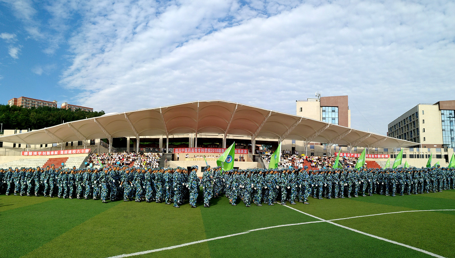 秦晓明书记宣布军训会操表演开始。在庄严的国歌声中军训分列式及汇操表演拉开序幕,走在分列式最前面的是60名同学组成的护旗方队,在国旗的引领下,代表我校发展历程的绵阳卫校、绵阳中医学校、绵阳医科学校、绵阳水力电力学校和四川中医药高等专科学校的旗帜紧跟其后,展示着学校的历史、传承与发展。每一个分列式方阵的同学都昂首挺胸,精神饱满,他们动作整齐划一、身姿矫健有力、口号雄壮嘹亮,充分展现了医专学子的力量和风采。