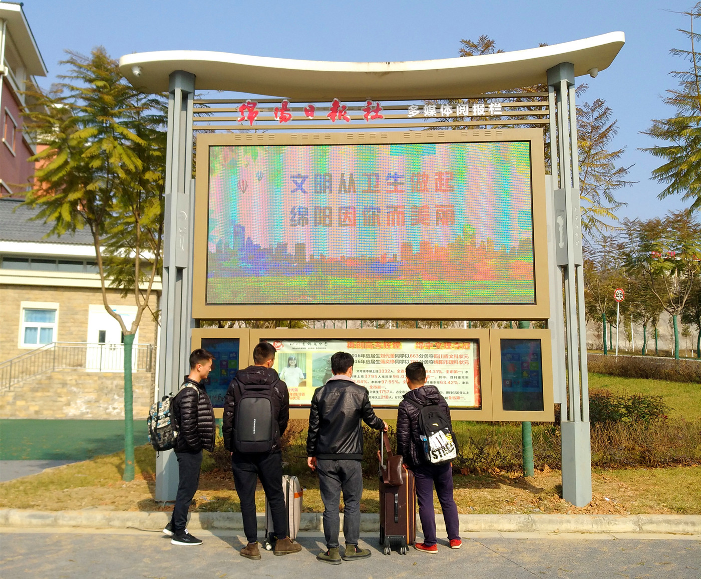 近日,我校与绵阳日报社合作的多媒体电子阅报栏在北校区落成,该电子阅报栏高5米,宽4.8米,集平面媒体信息、多媒体视频信息、LED视频信息、LCD互动点击、资讯发布于一体,刚刚落成便引起了放假准备回家的学生们的兴趣,他们上前点击触摸屏翻阅浏览新闻,惊喜的说:“这里面内容很多,有看头!”
