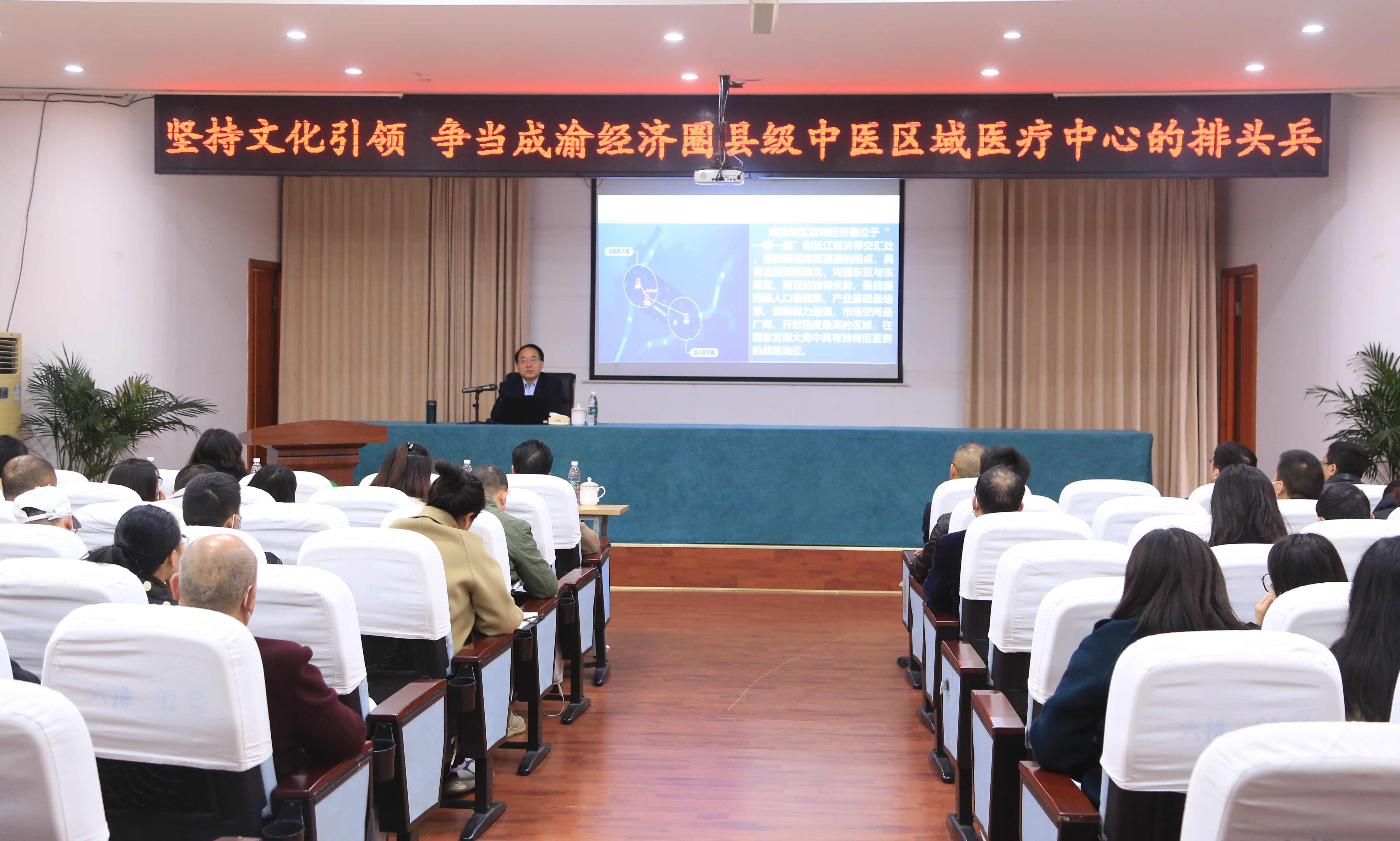 岳池县中医医院是我校非直属附属医院,去年6月我校与岳池县签订战略合作协议,充分发挥校地双方优势,加强医学人才培养,提升医院教学水平、科研及医疗服务能力,为社会培养更多高素质、高技能的应用型人才,更好服务成渝地区双城经济圈建设。秦晓明在辅导报告中强调,打造区域医疗中心医院必须具备核心竞争力,医院文化就是该核心竞争力的直接体现和力量源泉所在,岳池县中医医院如何在成渝双城经济圈重大战略中推动自身高质量发展,优秀的医院文化是栓心留人促进事业发展的根与魂,是促进医院核心竞争力、实现持续健康发展的重要举措。医院的发展要坚持文化引领,强化打造医院自身文化品牌,充分发挥区位优势,建成建好成渝经济圈标杆性县级中医区域医疗中心。