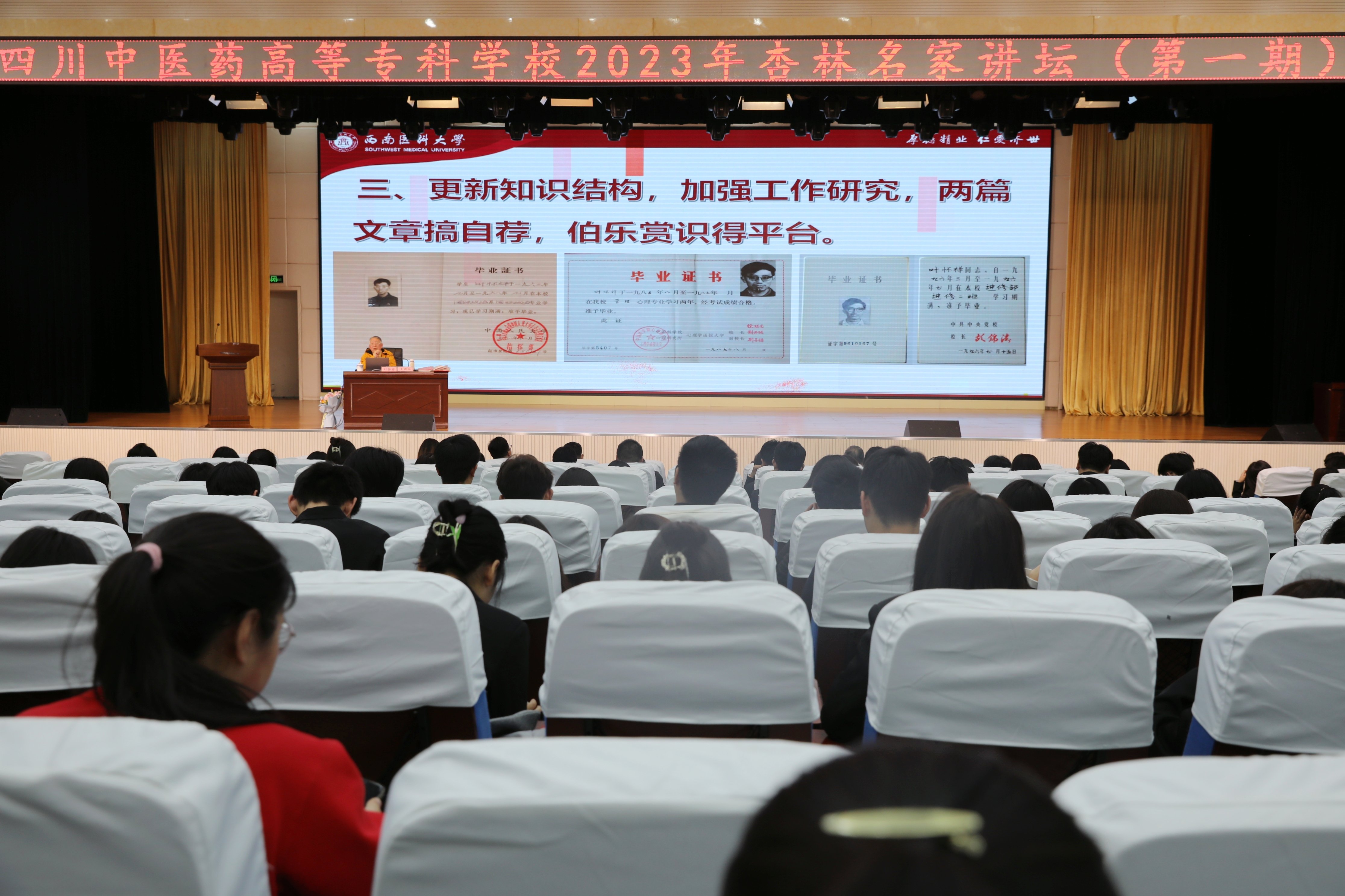 3月27日,我校2023年第一期“杏林名家讲坛”邀请到原泸州医学院党委书记、思想政治教育专业叶怀祥教授作专题报告;校党委书记秦晓明、副书记汪涌泉,副校长李祥、梁晓峰,纪委书记李文虎以及全体管理干部、青年教师、学生代表共400余人聆听了报告。