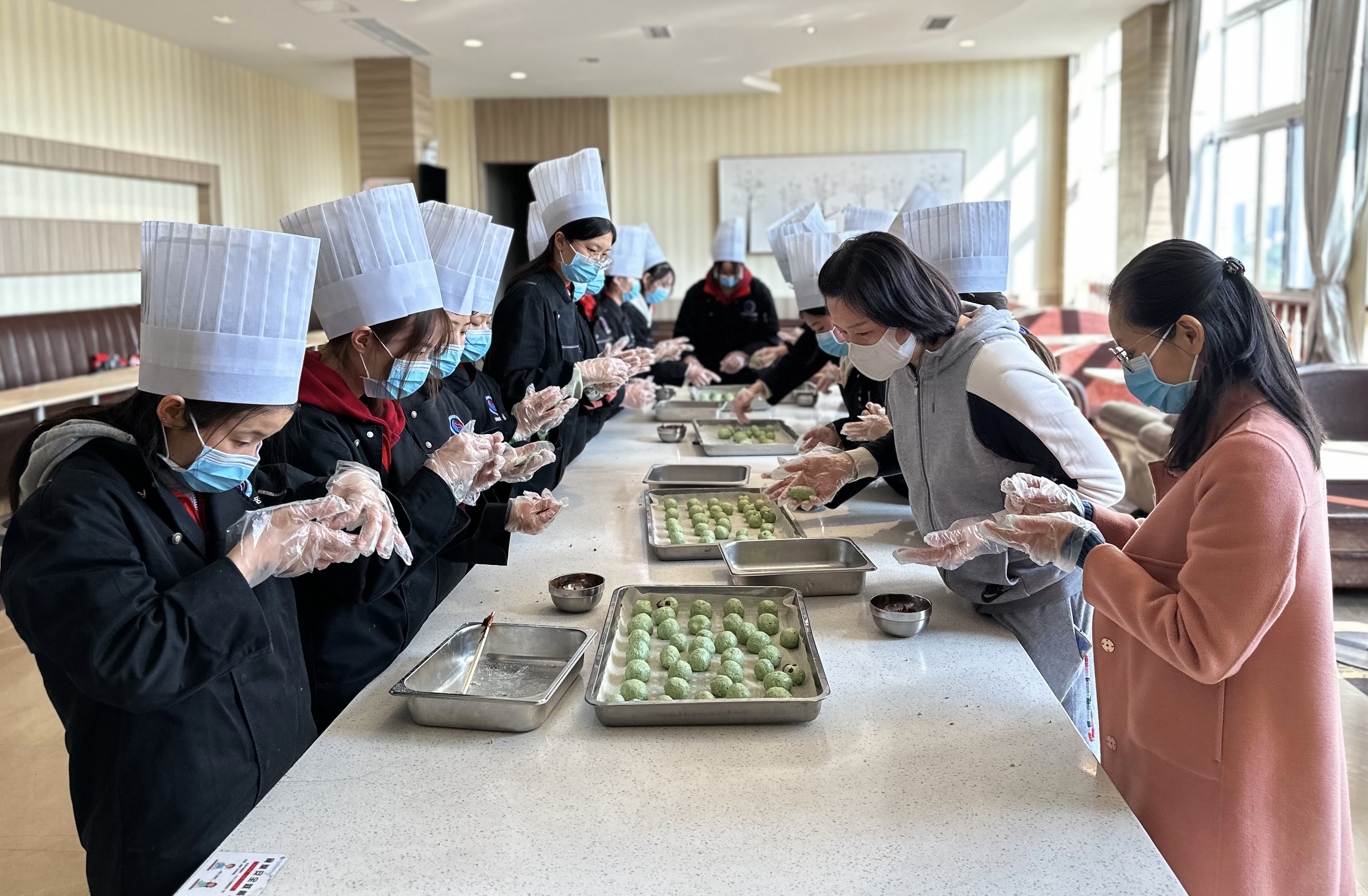 清明至,青团香,食堂提前推出了青团供师生品尝,并邀请师生代表一起制作青团。在制作过程中,工作人员对我国食青团的传统文化、制作方法等进行了讲解,通过制作和品尝美食弘扬中华传统文化,增强学生的劳动实践能力。