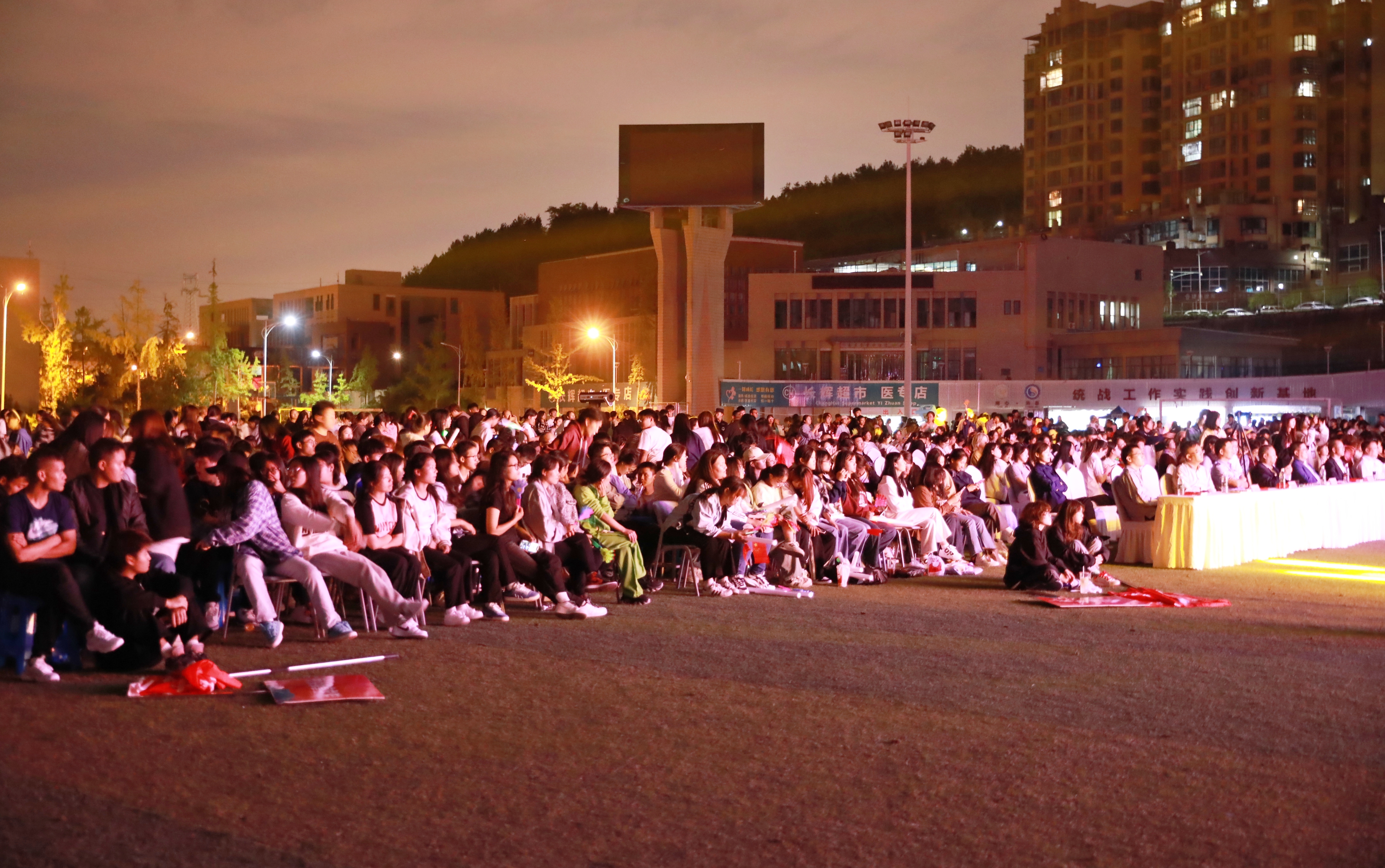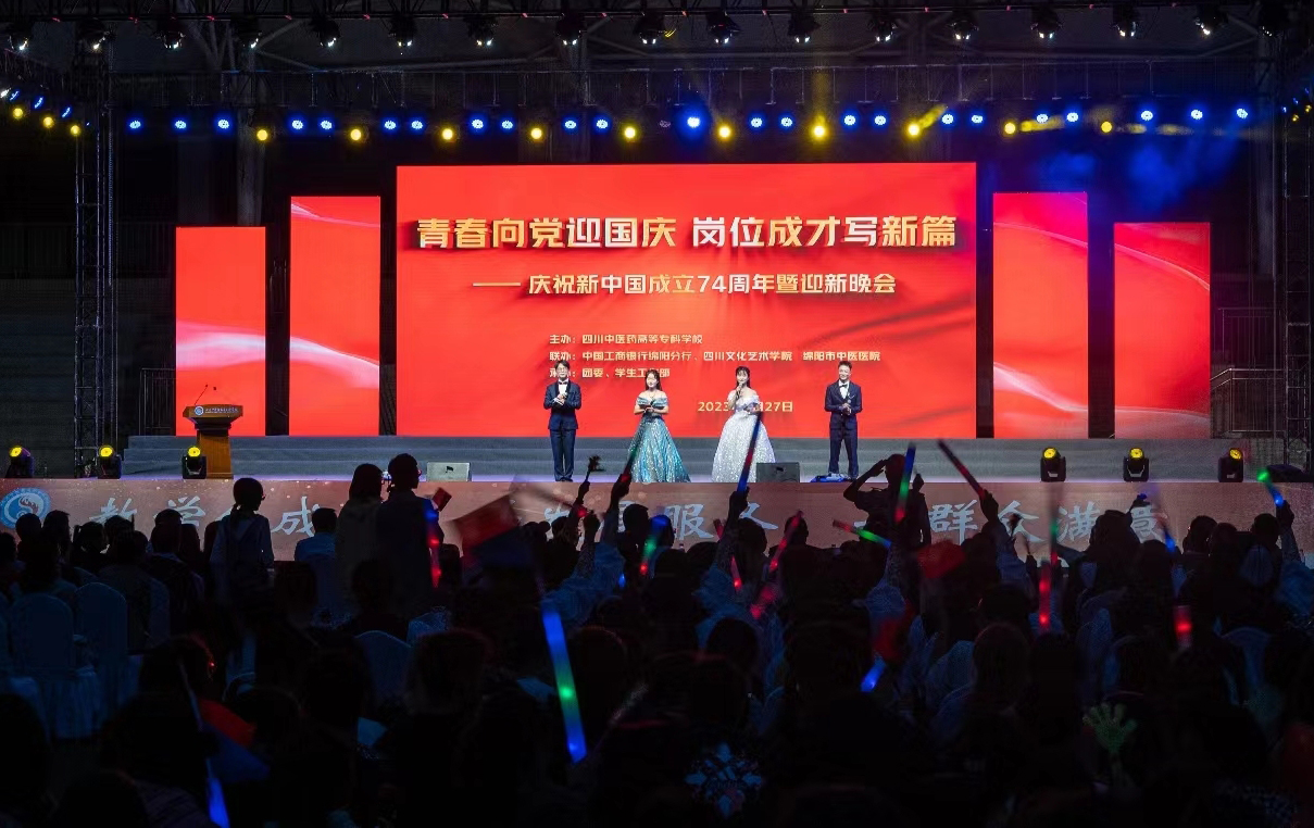 暑退九霄净,秋澄万景清。9月27日晚,我校“青春向党迎国庆 岗位成才写新篇”庆祝新中国成立74周年暨2023级迎新文艺演出晚会在南校区体育场举行,学校党委副书记、校长李祥,党委副书记汪涌泉,党委委员、副校长商碧辉,党委委员、纪委书记李文虎,以及特邀嘉宾中国工商银行绵阳分行党委书记、行长彭浪,绵阳市中医医院副院长李安洪等出席活动,与全校师生欢聚一堂,共同唱响青春的赞歌。