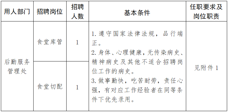 因工作需要,现面向社会公开招聘食堂工作人员2名。有关事项公告如下: