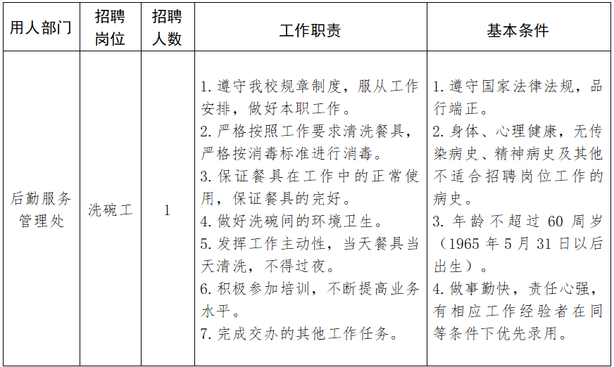 因工作需要,现面向社会公开招聘食堂洗碗工1名。有关事项公告如下: