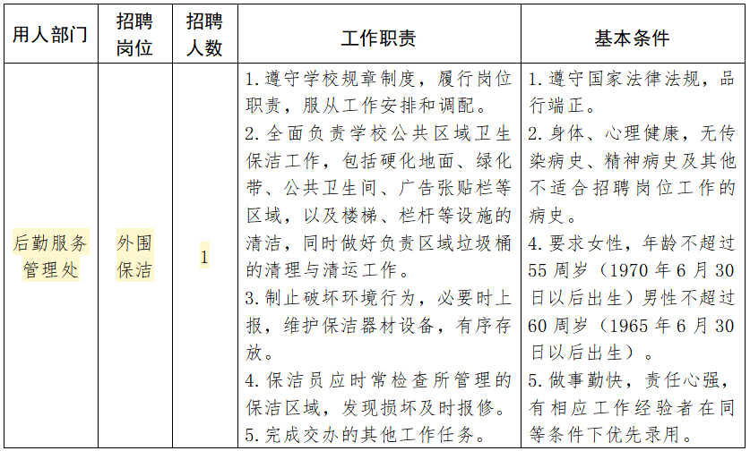 因工作需要,现面向社会公开招聘保洁1名。有关事项公告如下: