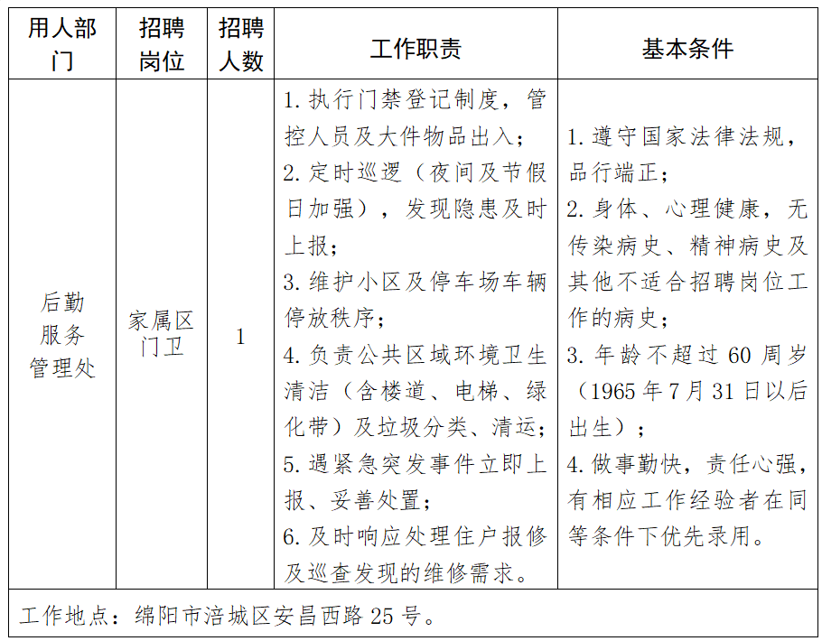 因工作需要,现面向社会公开招聘家属区门卫1名。有关事项公告如下: