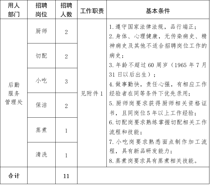 因工作需要,现面向社会公开招聘食堂工作人员数名。有关事项公告如下: