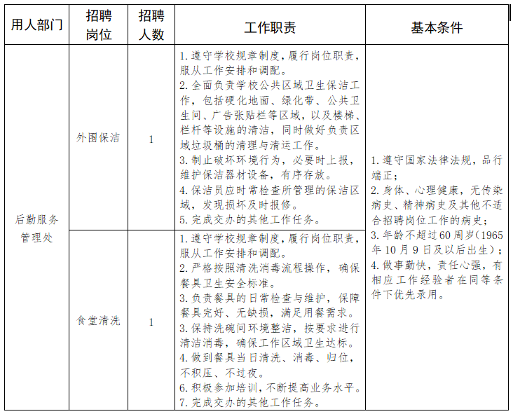 4.薪酬待遇:购买五险一金,外围保洁2200元/月、食堂清洗2800元/月(上述工资包含社会保险和住房公积金个人缴费部分)。