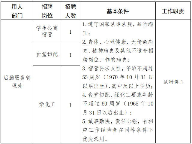 4.薪酬待遇:购买五险一金,学生公寓宿管2200元/月、食堂切配3000元/月、绿化工2400元/月(上述工资包含社会保险和住房公积金个人缴费部分)。