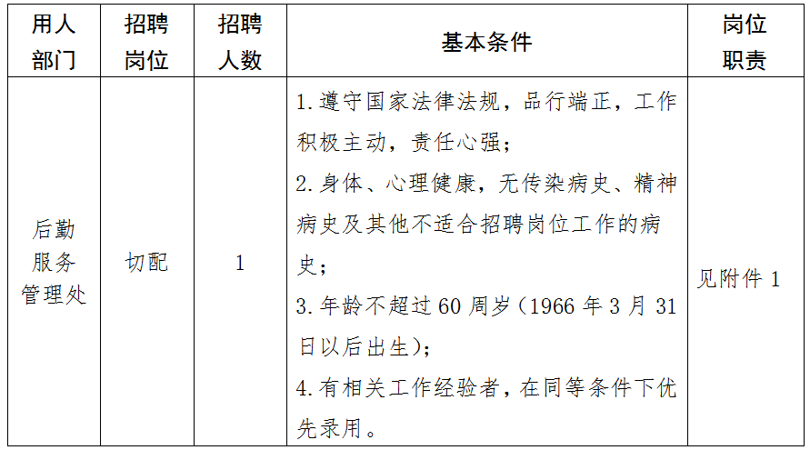 因工作需要,现面向社会公开招聘食堂切配1名。有关事项公告如下: