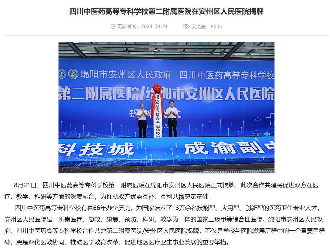 上一篇: 今日头条:四川中医药高等专科学校第二附属医院在安州区人民医院揭牌