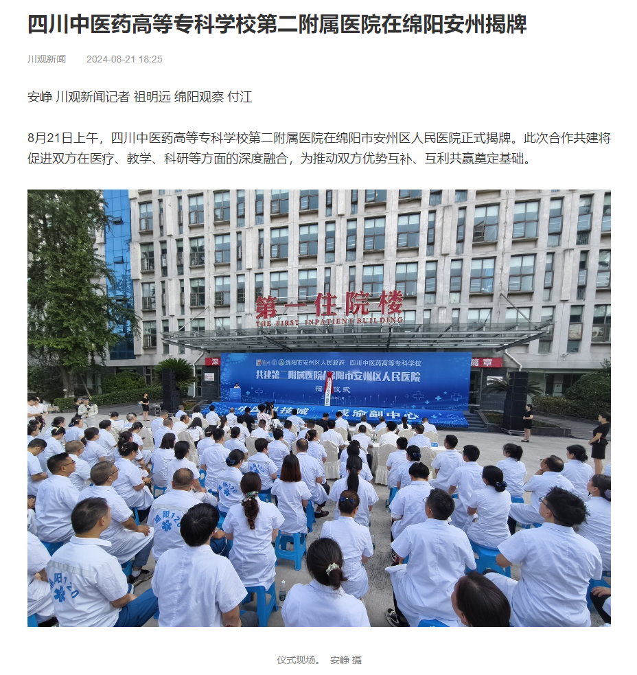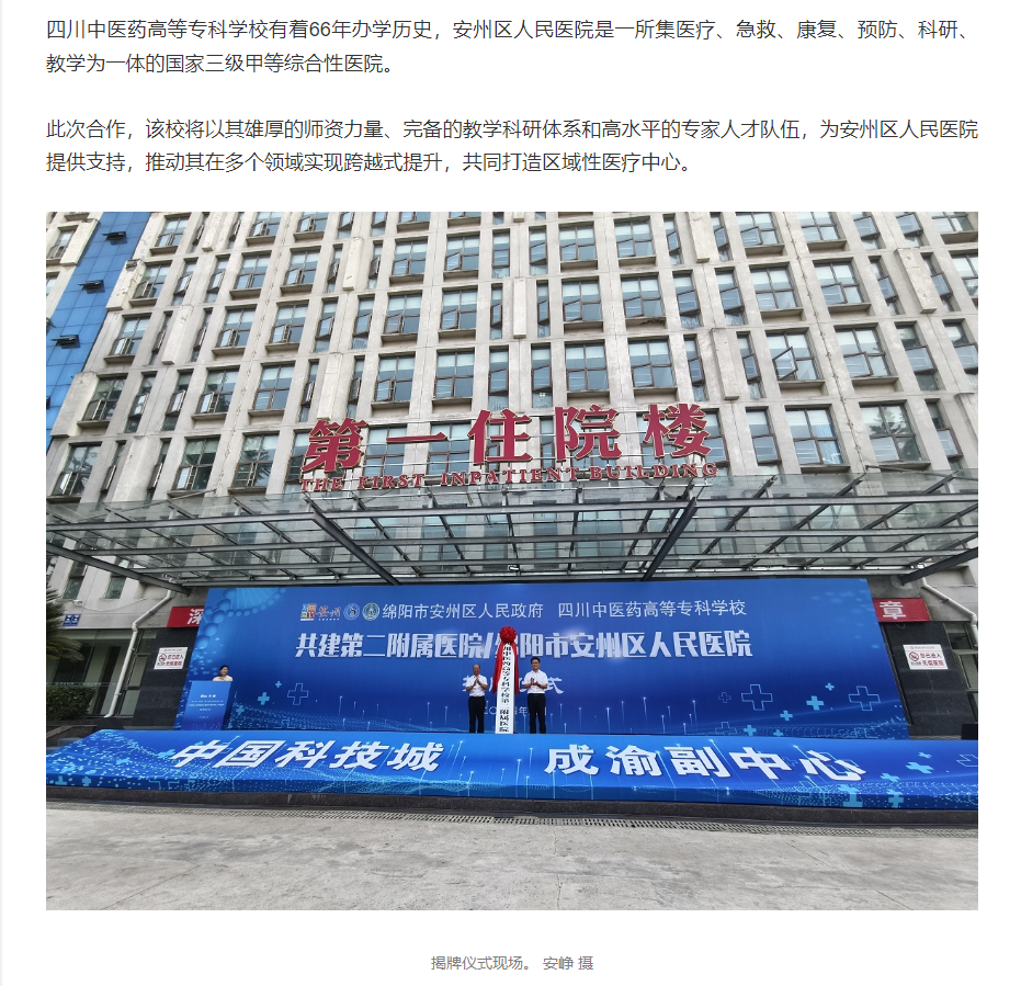下一篇: 今日头条:四川中医药高等专科学校第二附属医院在安州区人民医院揭牌