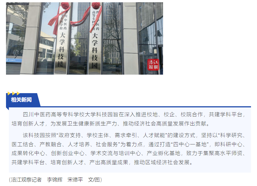 上一篇: 今日头条:科创领航推动校地企院高质量发展——四川医专大学科技园开园