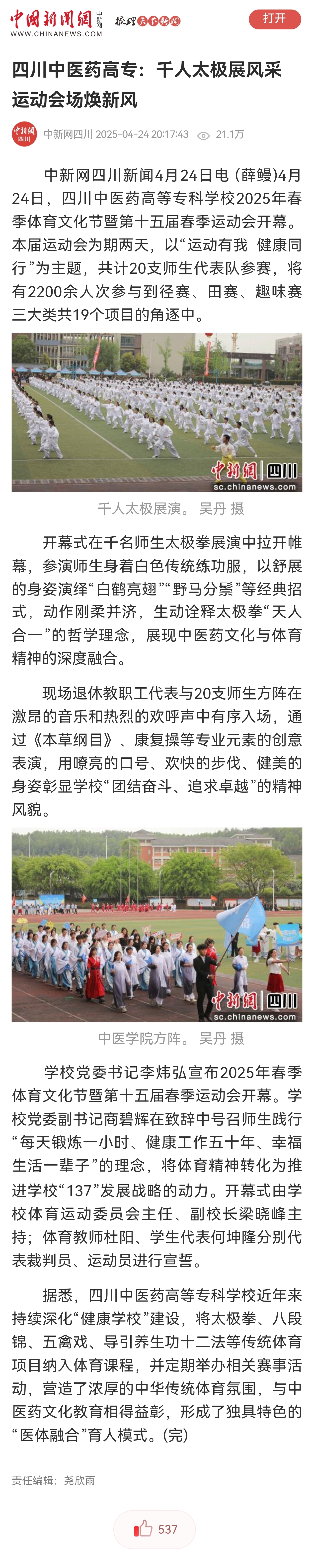 下一篇: 川观新闻:千人共打太极拳 绵阳这所高校运动会主打“医体融合”