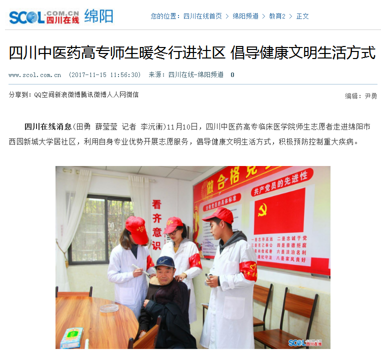 四川在线消息(田勇 薛莹莹 记者 李沅衡)11月10日,四川中医药高专临床医学院师生志愿者走进绵阳市西园新城大学居社区,利用自身专业优势开展志愿服务,倡导健康文明生活方式,积极预防控制重大疾病。
