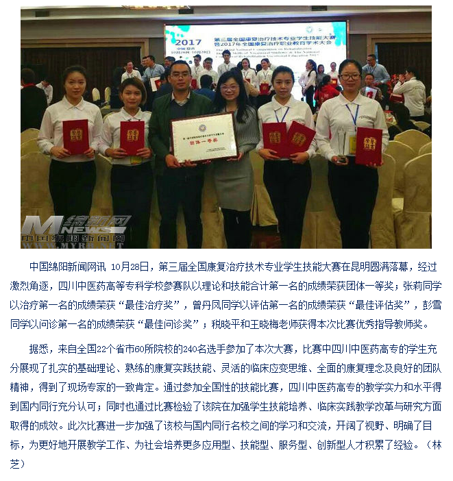 中国绵阳新闻网讯 10月28日,第三届全国康复治疗技术专业学生技能大赛在昆明圆满落幕,经过激烈角逐,四川中医药高等专科学校参赛队以理论和技能合计第一名的成绩荣获团体一等奖;张莉同学以治疗第一名的成绩荣获“最佳治疗奖”,曾丹凤同学以评估第一名的成绩荣获“最佳评估奖”,彭雪同学以问诊第一名的成绩荣获“最佳问诊奖”;税晓平和王晓梅老师获得本次比赛优秀指导教师奖。
