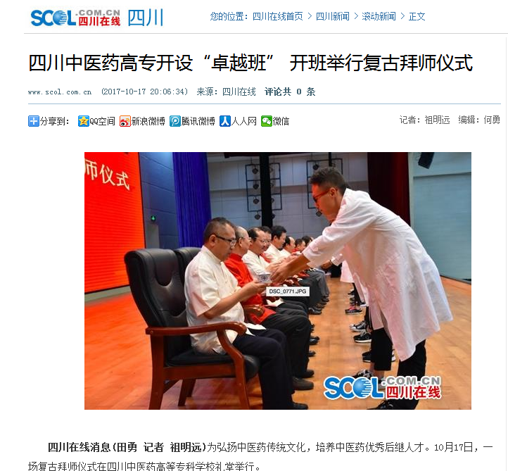 四川在线消息(田勇 记者 祖明远)为弘扬中医药传统文化,培养中医药优秀后继人才。10月17日,一场复古拜师仪式在四川中医药高等专科学校礼堂举行。