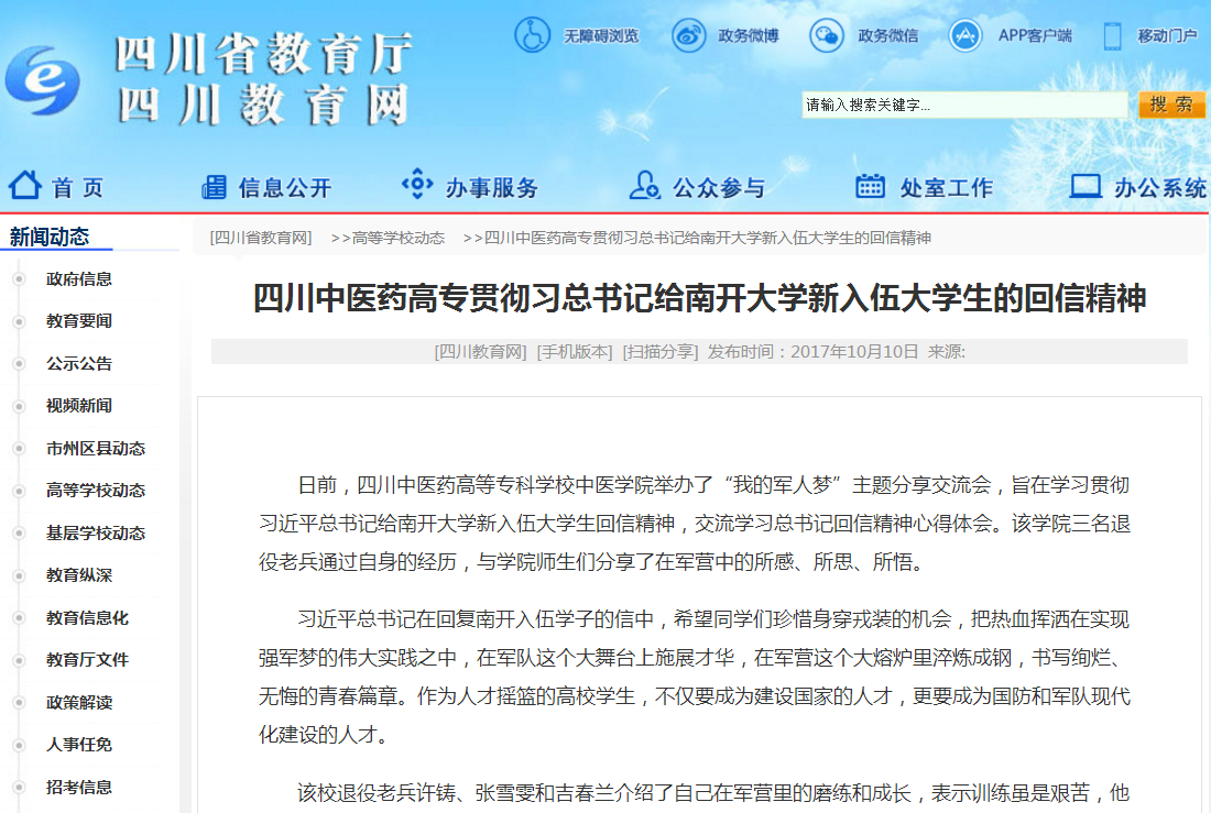 日前,四川中医药高等专科学校中医学院举办了“我的军人梦”主题分享交流会,旨在学习贯彻习近平总书记给南开大学新入伍大学生回信精神,交流学习习近平总书记回信精神心得体会。该学院三名退役老兵通过自身的经历,与学院师生们分享了在军营中的所感、所思、所悟。